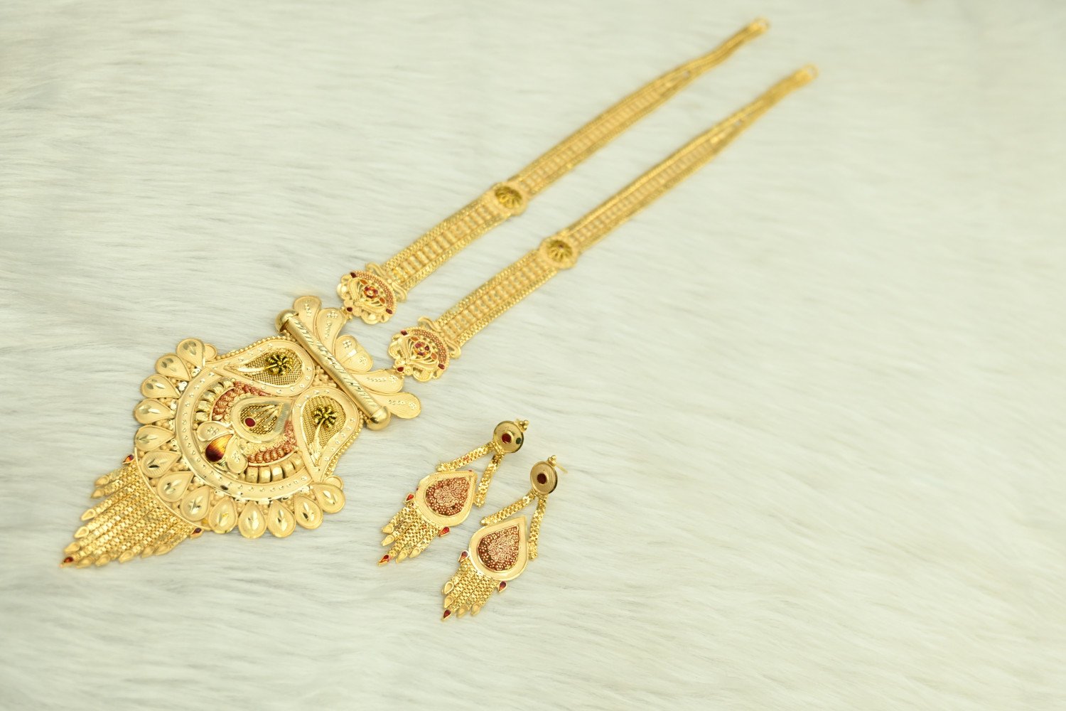 Command the room with the majestic splendor of our 1.5mg Gold Polish Rani Haar. This "Queen’s Necklace" is a masterpiece of traditional craftsmanship, featuring multi-layered strings and a grand centerpiece pendant. The premium 1.5mg gold plating offers a deep, regal luster that perfectly replicates the look of heritage gold, making it the ultimate statement piece for brides and wedding guests who desire a royal silhouette.