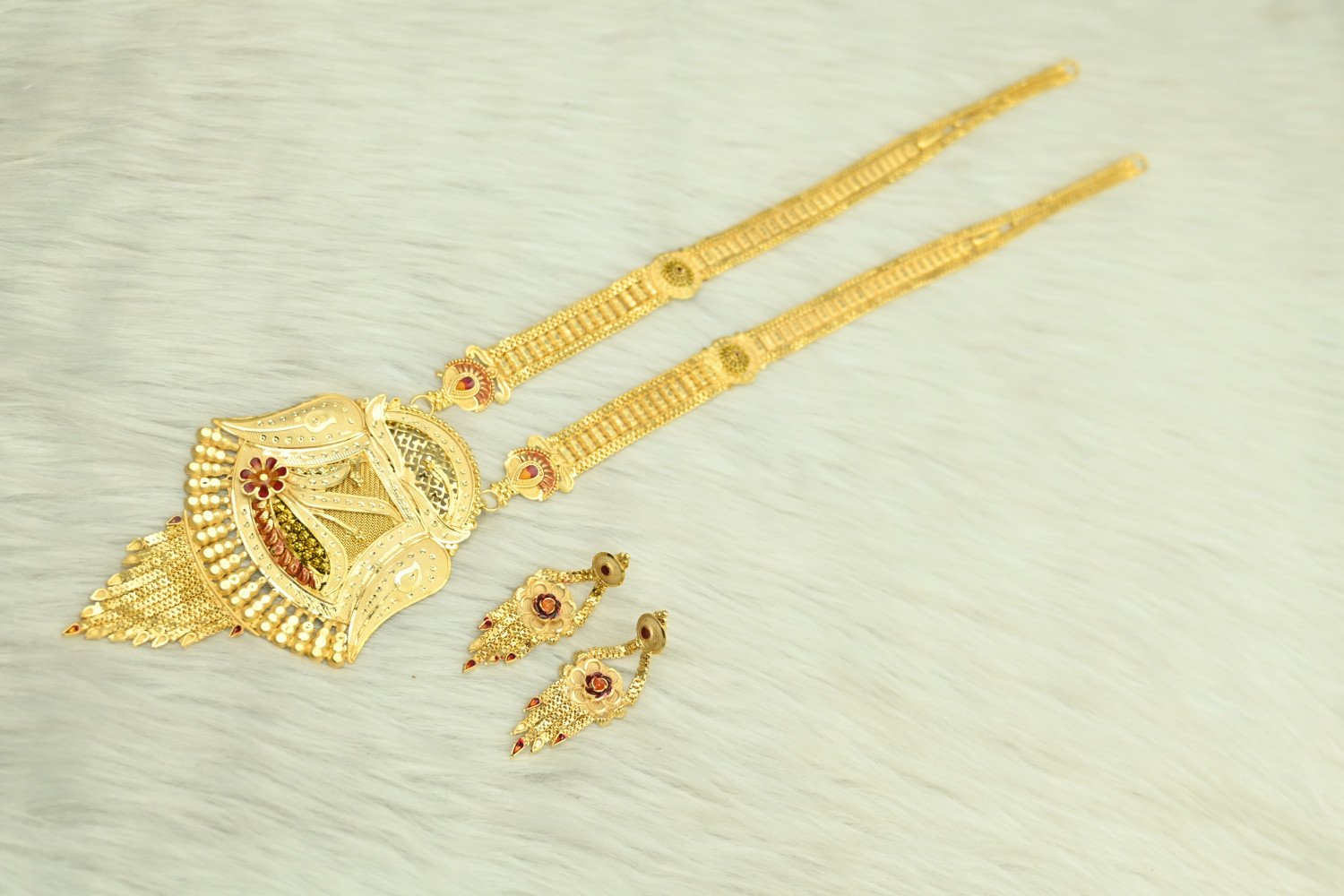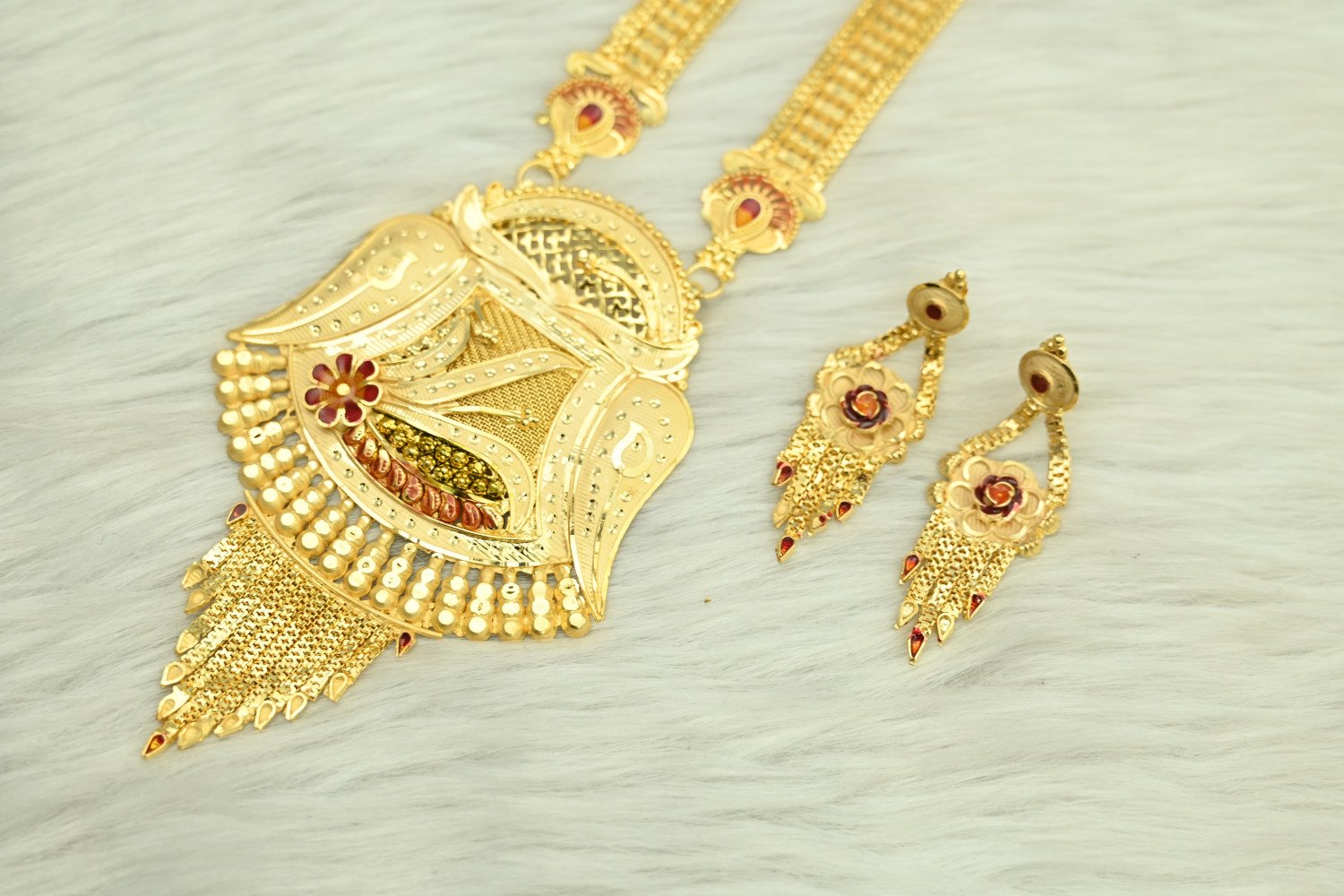 Command the room with the majestic splendor of our 1.5mg Gold Polish Rani Haar. This "Queen’s Necklace" is a masterpiece of traditional craftsmanship, featuring multi-layered strings and a grand centerpiece pendant. The premium 1.5mg gold plating offers a deep, regal luster that perfectly replicates the look of heritage gold, making it the ultimate statement piece for brides and wedding guests who desire a royal silhouette.