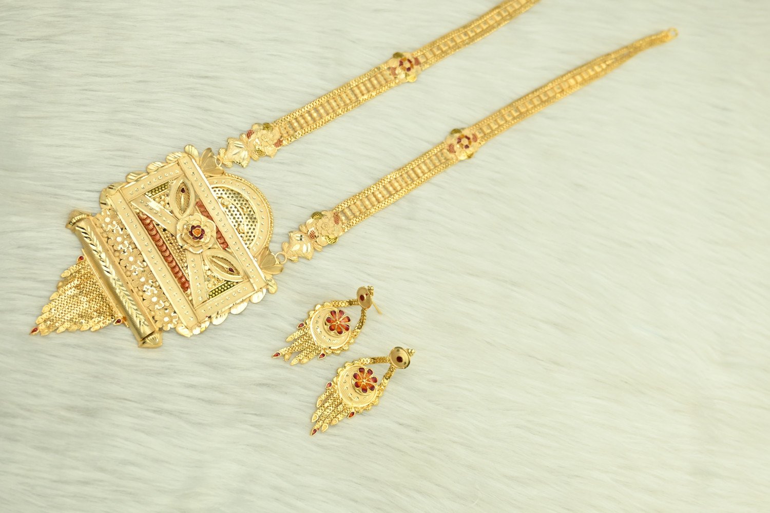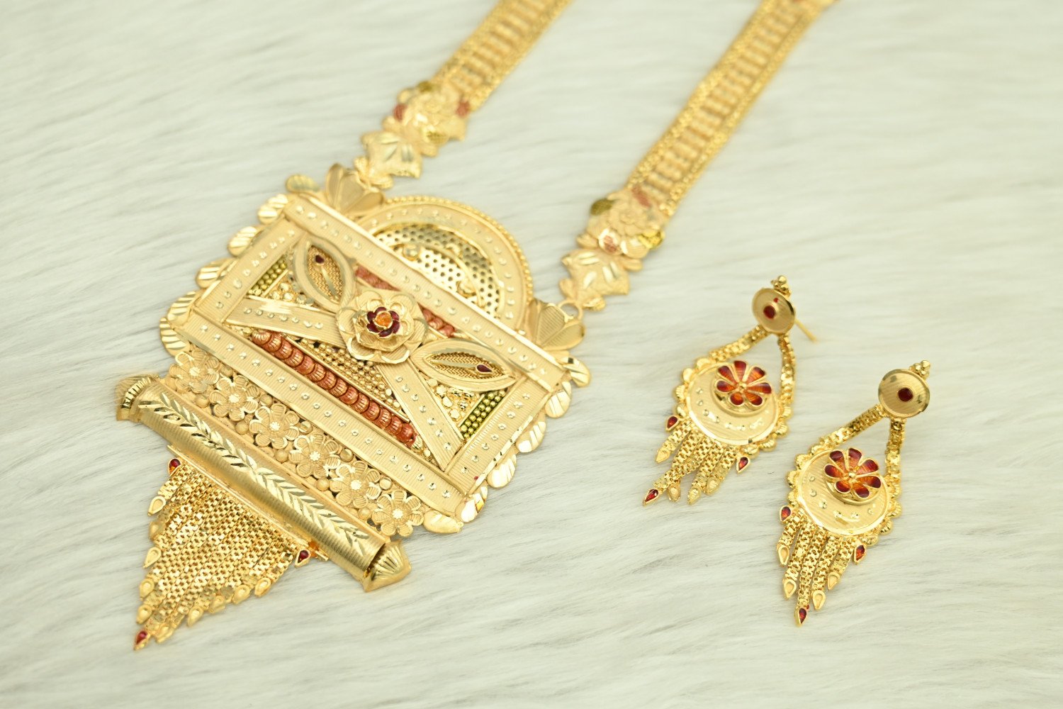 Command the room with the majestic splendor of our 1.5mg Gold Polish Rani Haar. This "Queen’s Necklace" is a masterpiece of traditional craftsmanship, featuring multi-layered strings and a grand centerpiece pendant. The premium 1.5mg gold plating offers a deep, regal luster that perfectly replicates the look of heritage gold, making it the ultimate statement piece for brides and wedding guests who desire a royal silhouette.