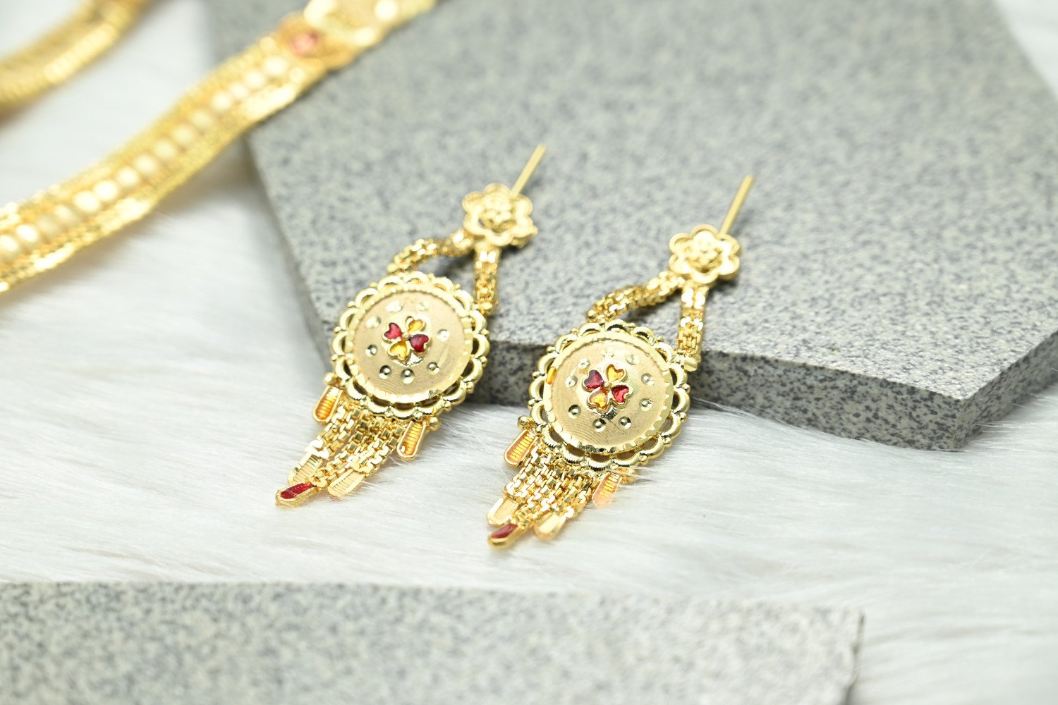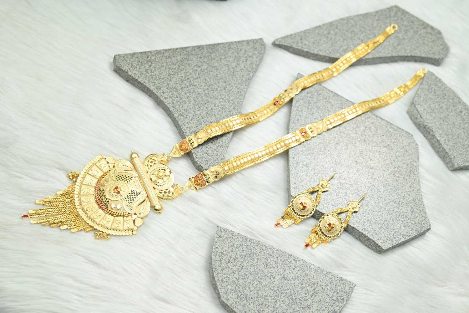 Command the room with the majestic splendor of our 1.5mg Gold Polish Rani Haar. This "Queen’s Necklace" is a masterpiece of traditional craftsmanship, featuring multi-layered strings and a grand centerpiece pendant. The premium 1.5mg gold plating offers a deep, regal luster that perfectly replicates the look of heritage gold, making it the ultimate statement piece for brides and wedding guests who desire a royal silhouette.