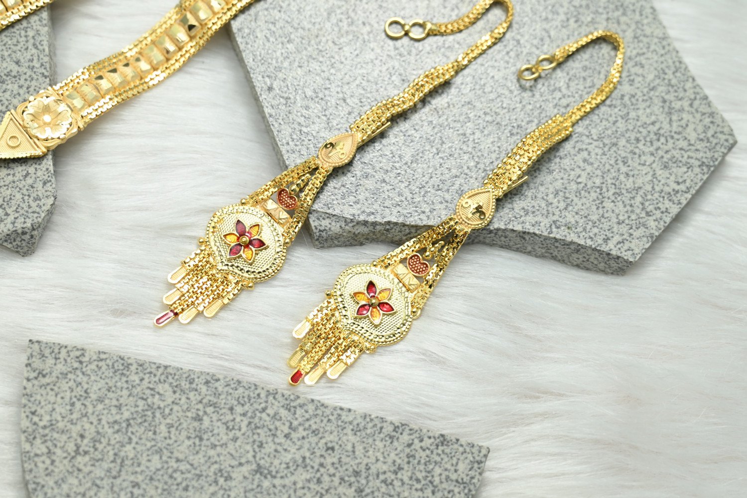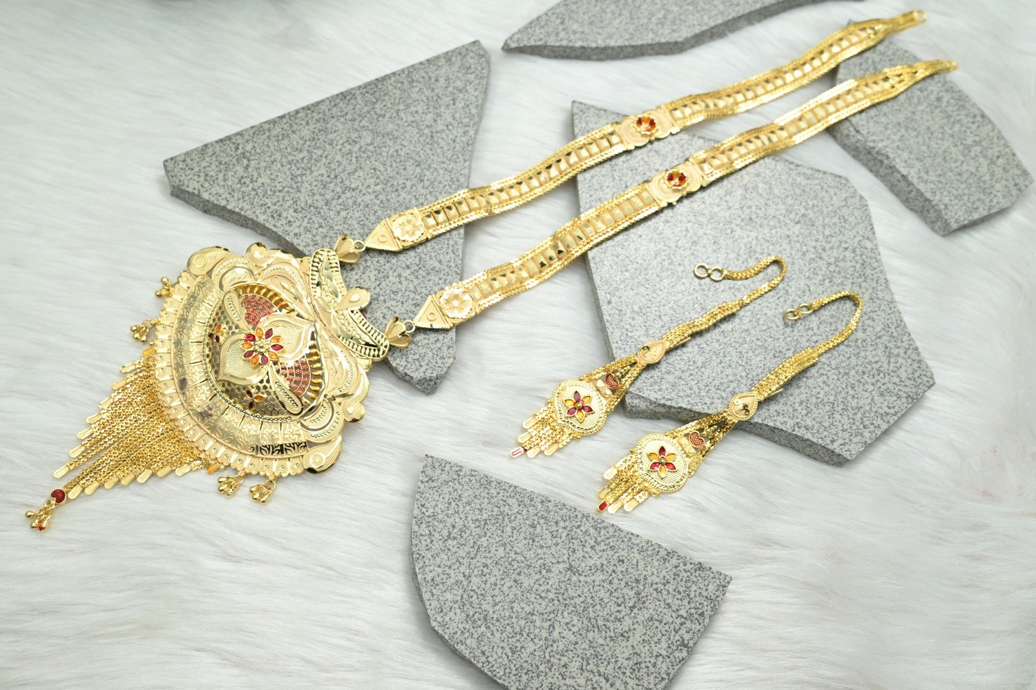 Command the room with the majestic splendor of our 1.5mg Gold Polish Rani Haar. This "Queen’s Necklace" is a masterpiece of traditional craftsmanship, featuring multi-layered strings and a grand centerpiece pendant. The premium 1.5mg gold plating offers a deep, regal luster that perfectly replicates the look of heritage gold, making it the ultimate statement piece for brides and wedding guests who desire a royal silhouette.