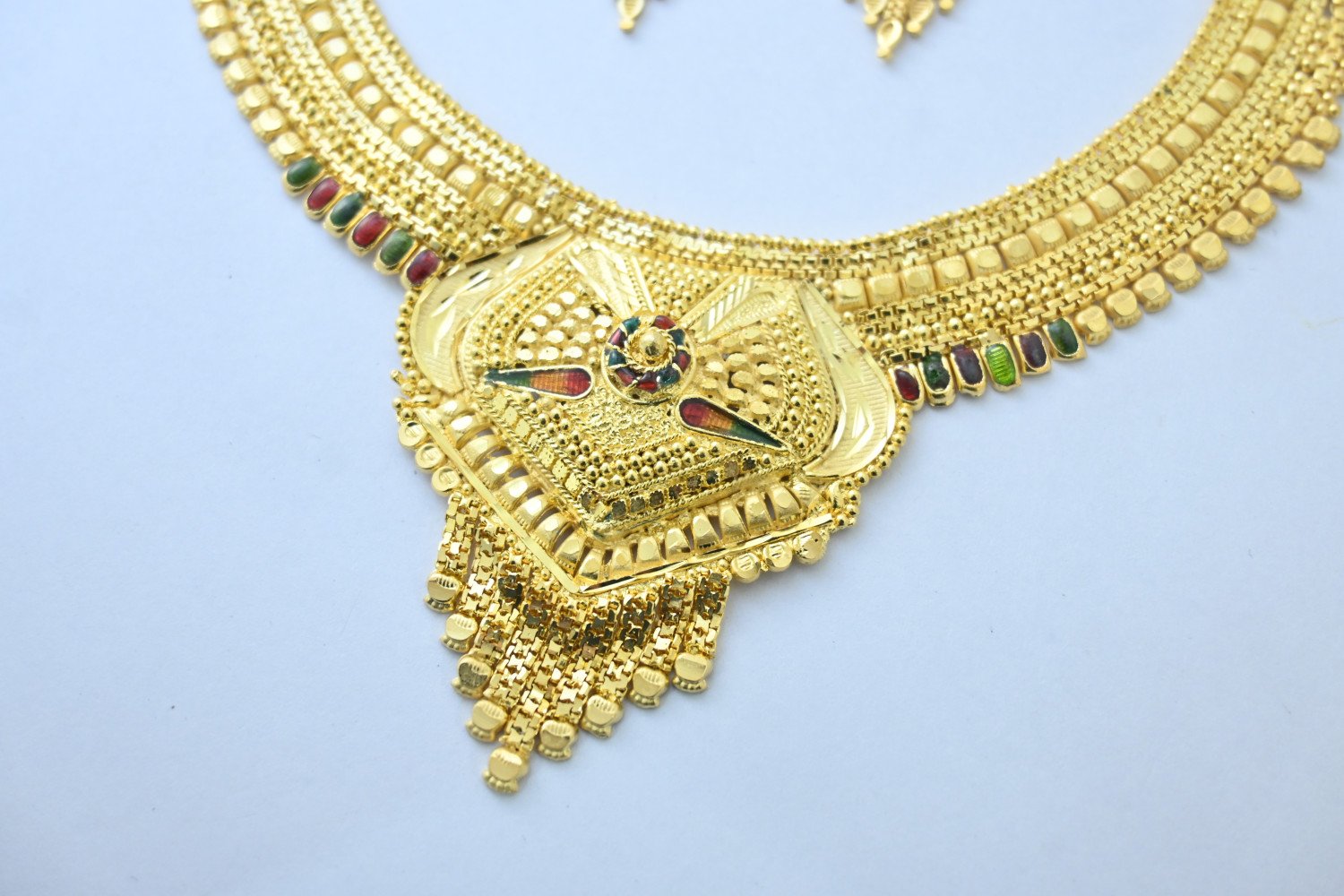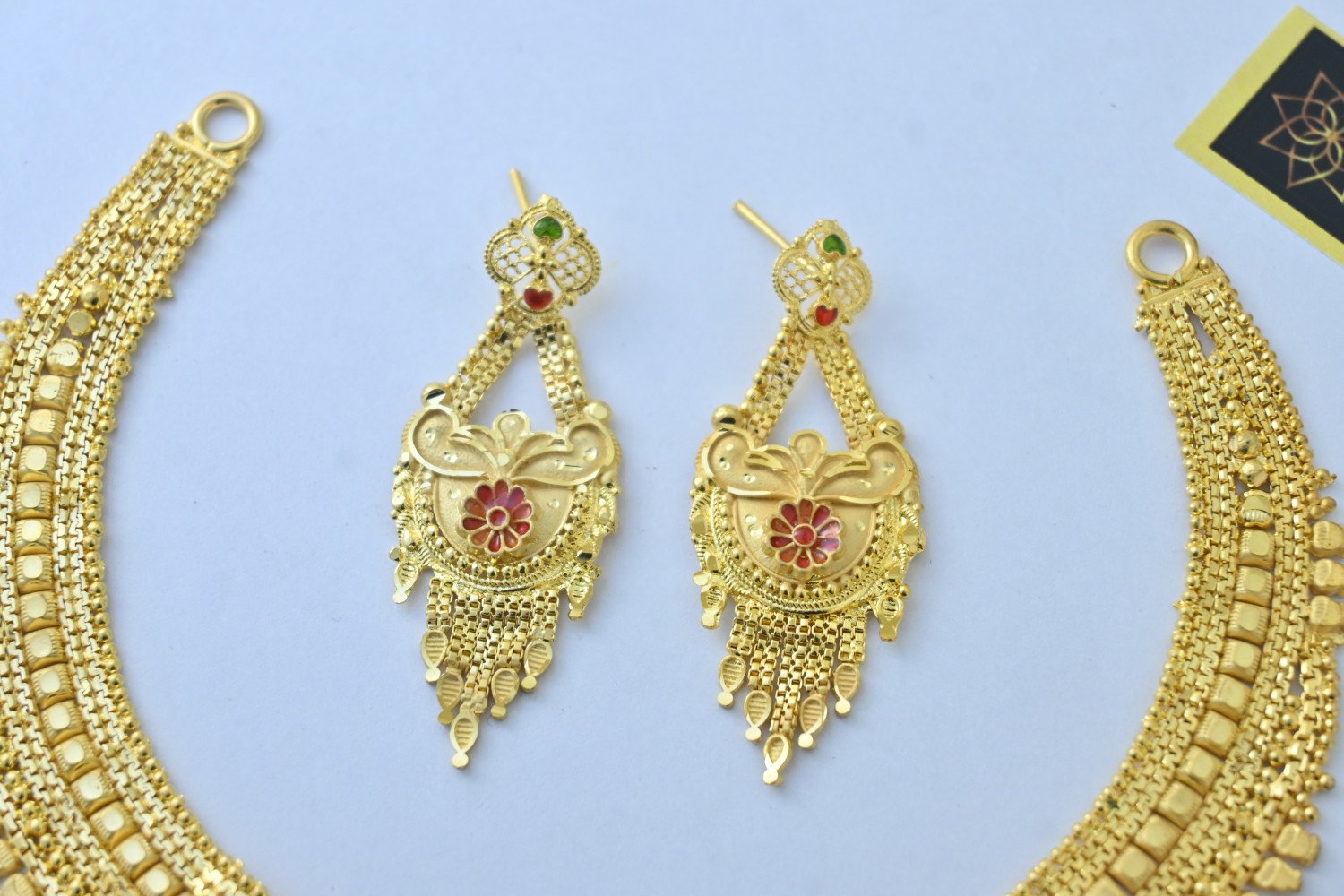 “Chic design meets elegant detail in this gold plate necklace set for the stylish lady. Features include a traditional texture, royal style, and latest trend design. Shining gold plating and brass construction ensure the necklace will make a lasting impression. Perfect for any occasion!” Laxmi Jewelers – our products are made from high quality material with best in comfort and look across the Globe. Our Brand is well known in jewelry sector and preferred by many Designers, Stars and Celebrities for the finest design. Perfect Gift our products are best as gift option for your Friends, Relative, Husband / Boyfriend during Anniversary, Birthday Valentines or any Festival. Care Instructions: Wipe your jewellery with a soft cloth after every use हर इस्तेमाल के बाद अपने आभूषण को एक मुलायम कपड़े से पोंछ लें Do not soak your jewellery in water आभूषण को पानी में न डुबाये Do not clean your jewellery in with soap or any other chemicals अपने आभूषणों को साबुन या किसी अन्य रसायन से साफ न करें Clean your jewellery using a soft brush, dipped in jewellery cleaning solution only केवल आभूषण की सफाई के रसायन के साथ एक नरम ब्रश का उपयोग करके अपने आभूषण को साफ करें Repolish : This item gets re-polished here. हमारे यहाँ इस सामान की वापस से पोलिश हो जाती है NOTE – While booking, please inquire about the length and width of the luggage and information number- 8090965577 बुकिंग करते टाइम सामान की लम्बाई चौड़ाई जरुर से पूछ लीजिये इनफार्मेशन नंबर- 8090965577