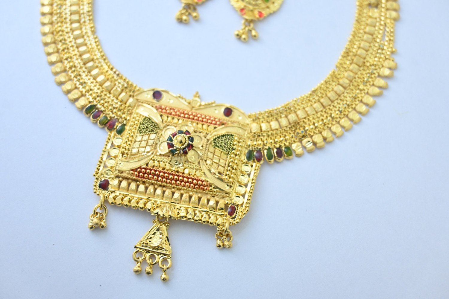 “Chic design meets elegant detail in this gold plate  necklace set for the stylish lady. Features include a traditional texture, royal style, and latest trend design. Shining gold plating and brass construction ensure the   necklace  will make a lasting impression. Perfect for any occasion!” Laxmi Jewelers – our products are made from high quality material with best in comfort and look across the Globe. Our Brand is well known in jewelry sector and preferred by many Designers, Stars and Celebrities for the finest design. Perfect Gift our products are best as gift option for your Friends, Relative, Husband / Boyfriend during Anniversary, Birthday Valentines or any Festival. Care Instructions: Wipe your jewellery with a soft cloth after every use हर इस्तेमाल के बाद अपने आभूषण को एक मुलायम कपड़े से पोंछ लें Do not soak your jewellery in water आभूषण को पानी में न डुबाये Do not clean your jewellery in with soap or any other chemicals अपने आभूषणों को साबुन या किसी अन्य रसायन से साफ न करें Clean your jewellery using a soft brush, dipped in jewellery cleaning solution only केवल आभूषण की सफाई के रसायन के साथ एक नरम ब्रश का उपयोग करके अपने आभूषण को साफ करें  Repolish : This item gets re-polished here. हमारे यहाँ इस सामान की वापस से पोलिश हो जाती है NOTE – While booking, please inquire about the length and width of the luggage and information number- 8090965577 बुकिंग करते टाइम सामान की लम्बाई चौड़ाई जरुर से पूछ लीजिये इनफार्मेशन नंबर- 8090965577