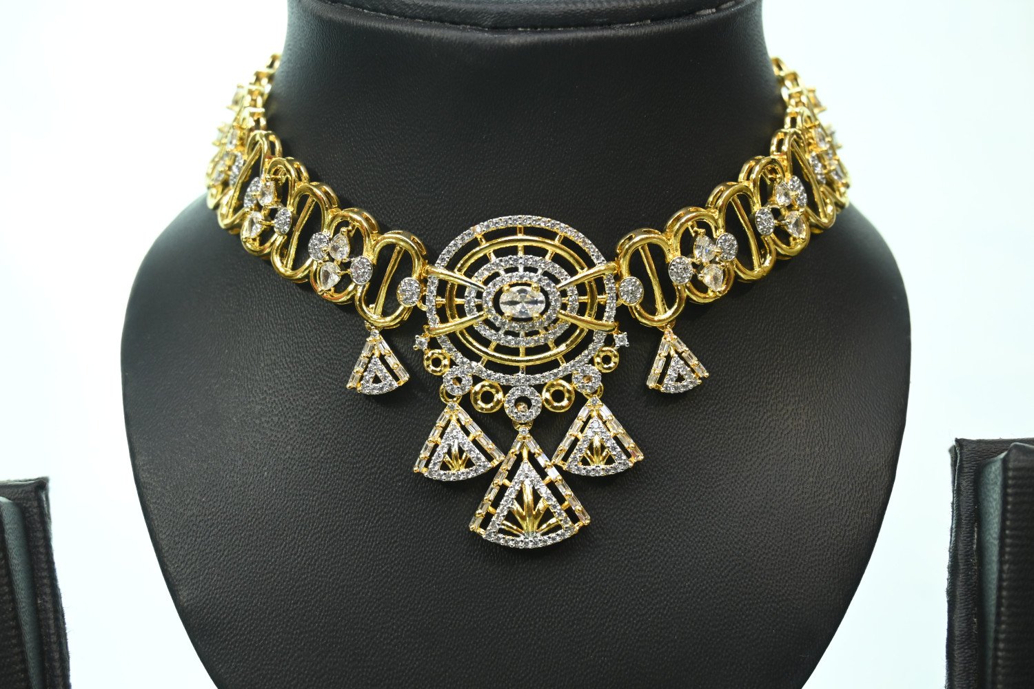 “Chic design meets elegant detail in this gold plated a.d. choker for the stylish ladies. Features include a traditional texture, royal style, and latest trend design. Shining gold plating and brass construction ensure the a.d. choker will make a lasting impression. Perfect for any occasion!”