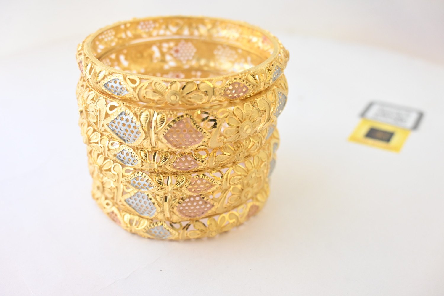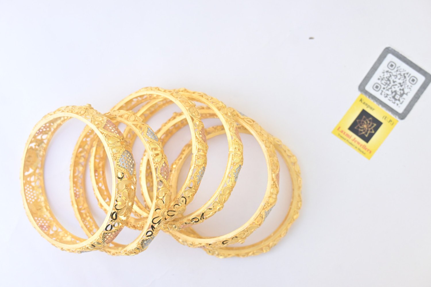 Product Colour: 1.5gms 24 Carat Gold Plated (1.5mm thick gold layer coated over it) Polish: Gold Plated Base metal: Brass/ Alloy Occasion: Bridal, Gifting, Party * 1.5gms 24 Carat Gold Plated ( 1.5mm thick gold layer coated over it) “Chic design meets elegant detail in this gold plated bangles set for the stylish lady. Features include a traditional texture, royal style, and latest trend design. Shining gold plating and brass construction ensure the bangles will make a lasting impression. Perfect for any occasion!” Laxmi Jewelers – our products are made from high quality material with best in comfort and look across the Globe. Our Brand is well known in jewelry sector and preferred by many Designers, Stars and Celebrities for the finest design. Perfect Gift our products are best as gift option for your Friends, Relative, Husband / Boyfriend during Anniversary, Birthday Valentines or any Festival. Care Instructions: Wipe your jewellery with a soft cloth after every use हर इस्तेमाल के बाद अपने आभूषण को एक मुलायम कपड़े से पोंछ लें Do not soak your jewellery in water आभूषण को पानी में न डुबाये Do not clean your jewellery in with soap or any other chemicals अपने आभूषणों को साबुन या किसी अन्य रसायन से साफ न करें Clean your jewellery using a soft brush, dipped in jewellery cleaning solution only केवल आभूषण की सफाई के रसायन के साथ एक नरम ब्रश का उपयोग करके अपने आभूषण को साफ करें
