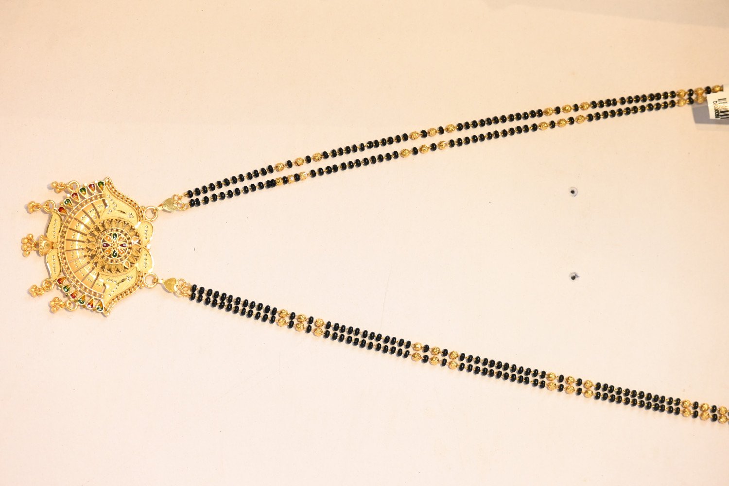 “Chic design meets elegant detail in this gold plated mangalshutra for the stylish ladies. Features include a traditional texture, royal style, and latest trend design. Shining gold plating and brass construction ensure the mangalshutra will make a lasting impression. Perfect for any occasion!”