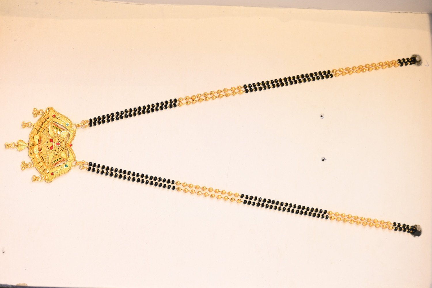 “Chic design meets elegant detail in this gold plated mangalshutra for the stylish ladies. Features include a traditional texture, royal style, and latest trend design. Shining gold plating and brass construction ensure the mangalshutra will make a lasting impression. Perfect for any occasion!”