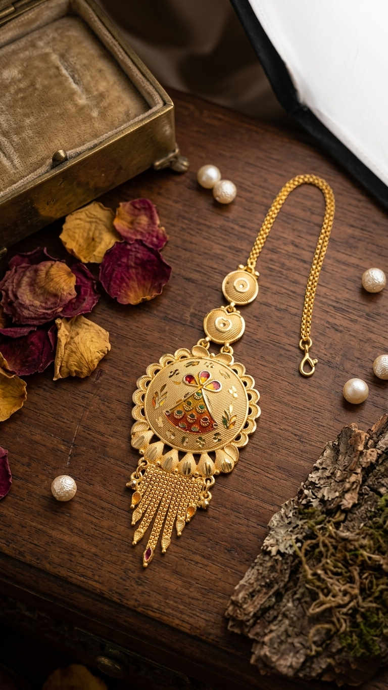 Crown your look with the divine elegance of our 1.5mg Gold Polish Maang Tikka. As the crowning jewel of a woman's shringar, this piece is a masterclass in intricate artistry. Featuring exquisite detailing and a flawless finish, our Maang Tikka is designed to sit gracefully on the forehead, framing the face with a glow that is nothing short of celestial. The premium 1.5mg gold plating ensures a rich, authentic brilliance that captures the soul of traditional Indian heritage.