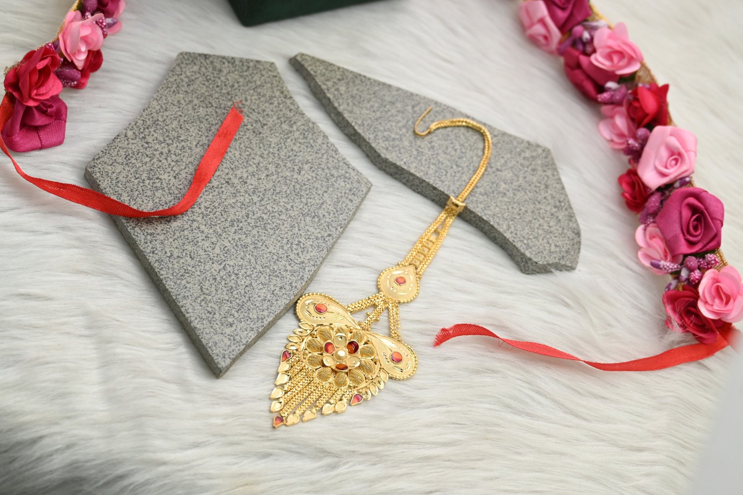 Crown your look with the divine elegance of our 1.5mg Gold Polish Maang Tikka. As the crowning jewel of a woman's shringar, this piece is a masterclass in intricate artistry. Featuring exquisite detailing and a flawless finish, our Maang Tikka is designed to sit gracefully on the forehead, framing the face with a glow that is nothing short of celestial. The premium 1.5mg gold plating ensures a rich, authentic brilliance that captures the soul of traditional Indian heritage.