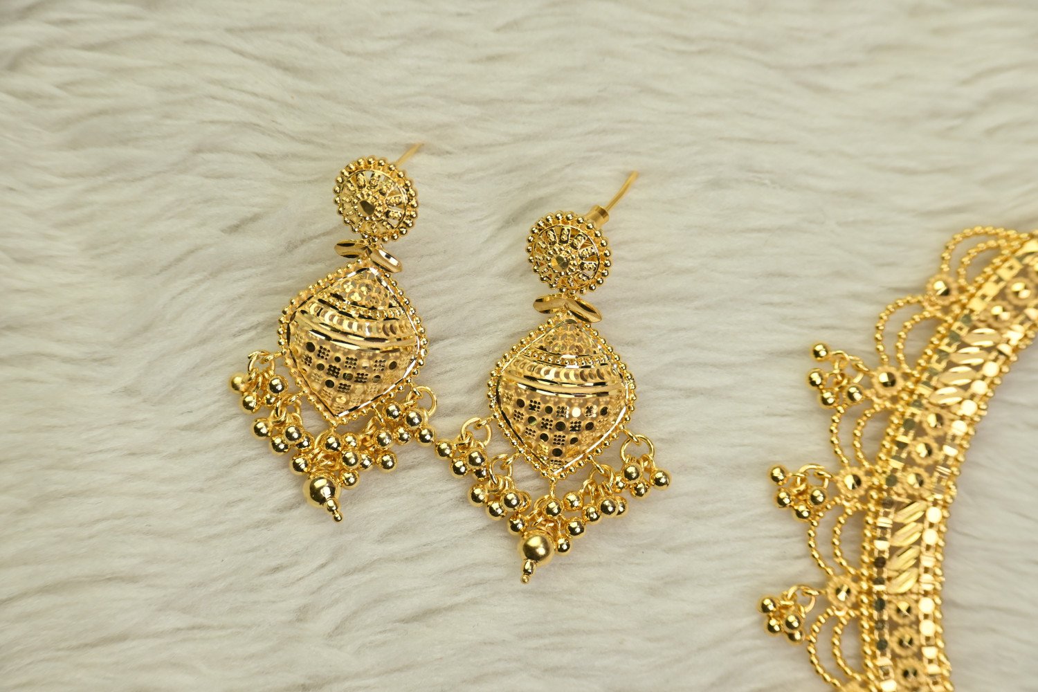 “Chic design meets elegant detail in this gold plated necklace for the stylish ladies. Features include a traditional texture, royal style, and latest trend design. Shining gold plating and brass construction ensure the necklace will make a lasting impression. Perfect for any occasion!”