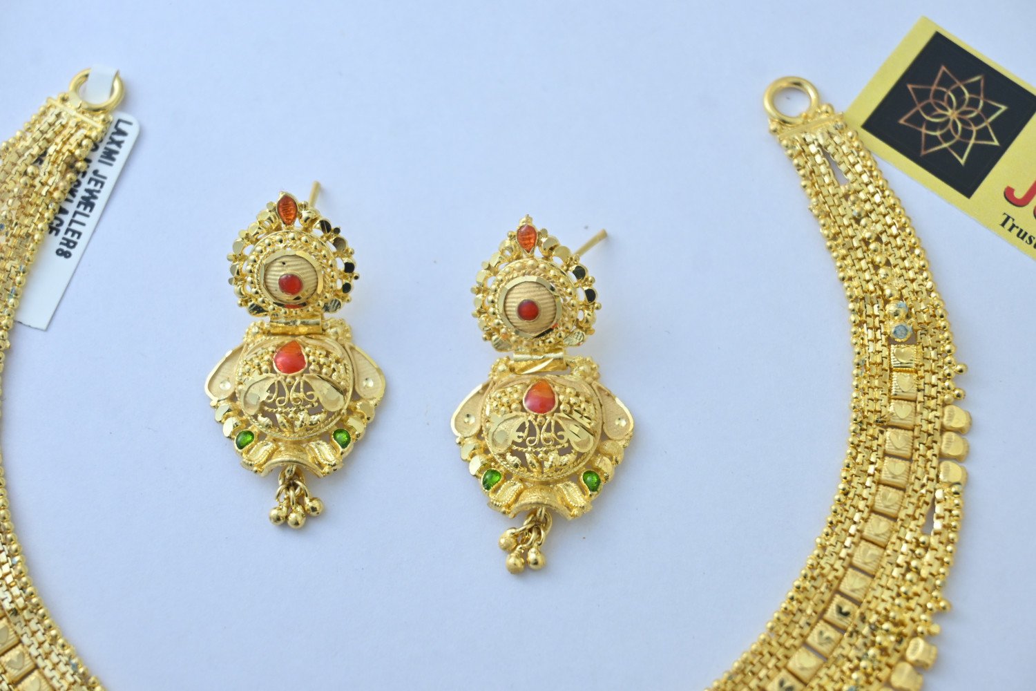 “Chic design meets elegant detail in this gold plate  necklace set for the stylish lady. Features include a traditional texture, royal style, and latest trend design. Shining gold plating and brass construction ensure the   necklace  will make a lasting impression. Perfect for any occasion!” Laxmi Jewelers – our products are made from high quality material with best in comfort and look across the Globe. Our Brand is well known in jewelry sector and preferred by many Designers, Stars and Celebrities for the finest design. Perfect Gift our products are best as gift option for your Friends, Relative, Husband / Boyfriend during Anniversary, Birthday Valentines or any Festival. Care Instructions: Wipe your jewellery with a soft cloth after every use हर इस्तेमाल के बाद अपने आभूषण को एक मुलायम कपड़े से पोंछ लें Do not soak your jewellery in water आभूषण को पानी में न डुबाये Do not clean your jewellery in with soap or any other chemicals अपने आभूषणों को साबुन या किसी अन्य रसायन से साफ न करें Clean your jewellery using a soft brush, dipped in jewellery cleaning solution only केवल आभूषण की सफाई के रसायन के साथ एक नरम ब्रश का उपयोग करके अपने आभूषण को साफ करें  Repolish : This item gets re-polished here. हमारे यहाँ इस सामान की वापस से पोलिश हो जाती है NOTE – While booking, please inquire about the length and width of the luggage and information number- 8090965577 बुकिंग करते टाइम सामान की लम्बाई चौड़ाई जरुर से पूछ लीजिये इनफार्मेशन नंबर- 8090965577