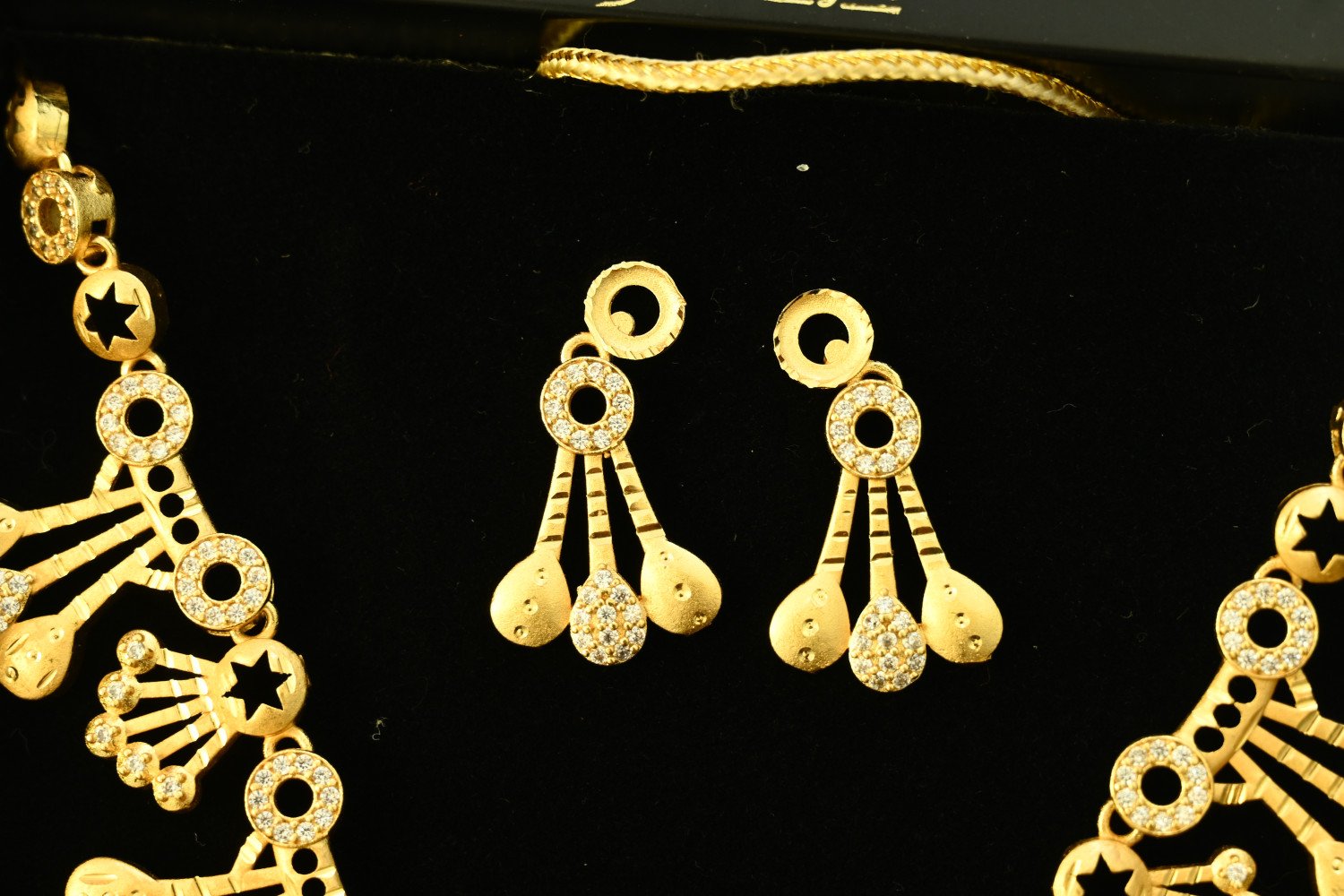 10. The earrings follow the same design language as the necklace, with a similar central floral motif and hanging droplet elements.