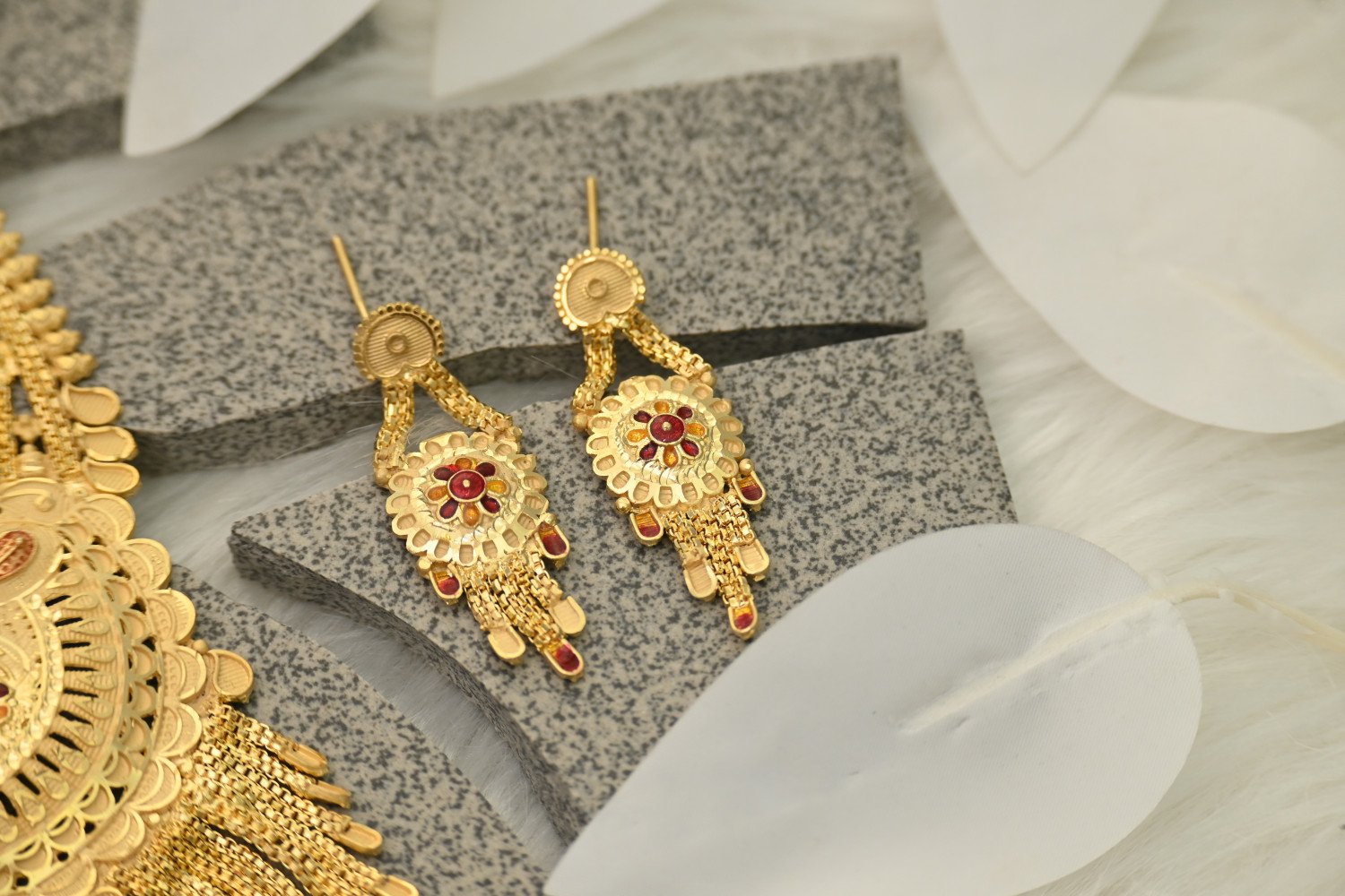 “Chic design meets elegant detail in this gold plated necklace for the stylish ladies. Features include a traditional texture, royal style, and latest trend design. Shining gold plating and brass construction ensure the necklace will make a lasting impression. Perfect for any occasion!”