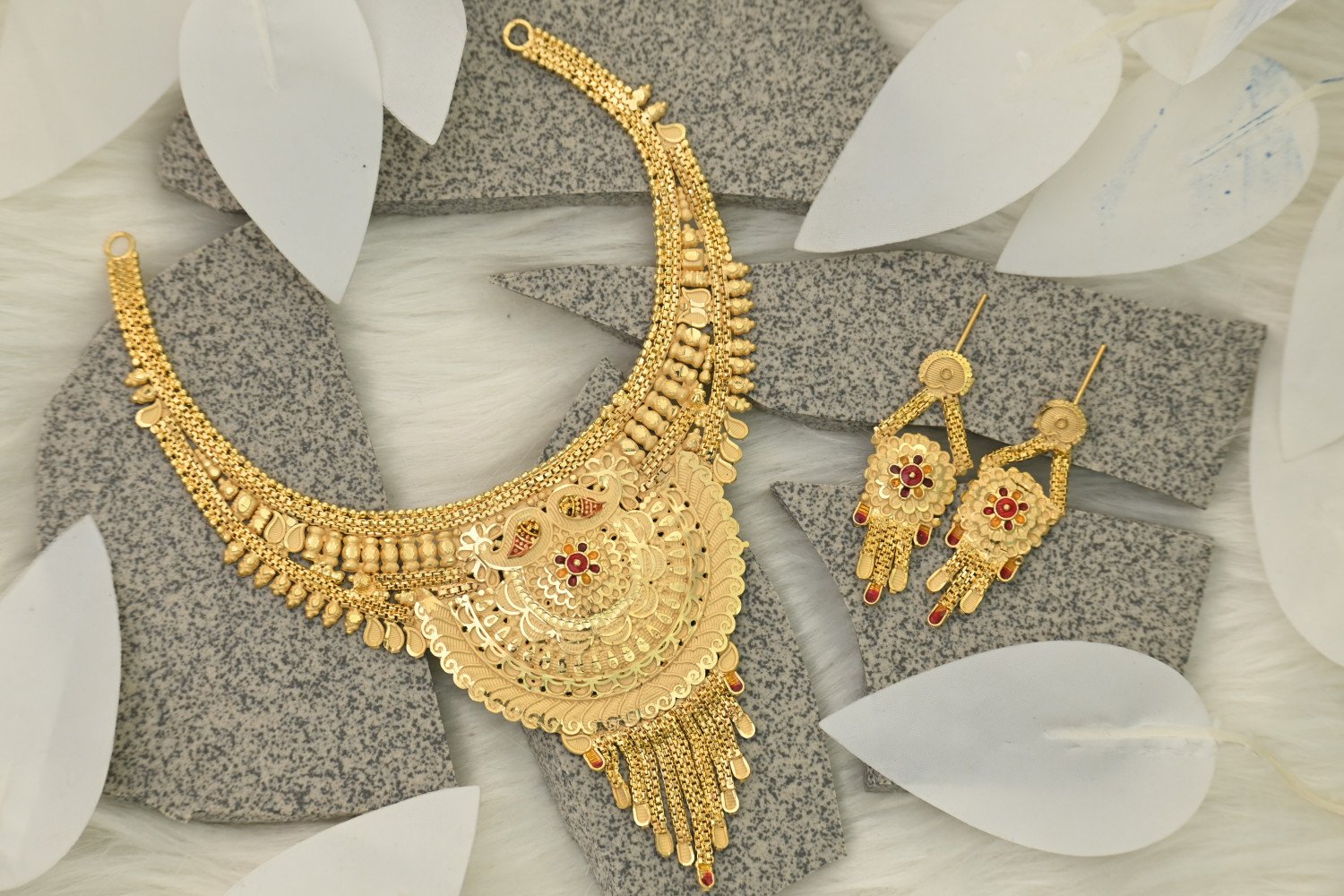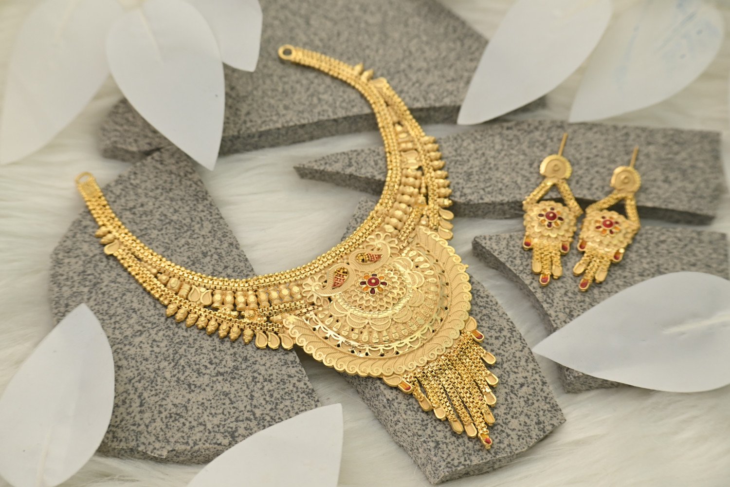“Chic design meets elegant detail in this gold plated necklace for the stylish ladies. Features include a traditional texture, royal style, and latest trend design. Shining gold plating and brass construction ensure the necklace will make a lasting impression. Perfect for any occasion!”