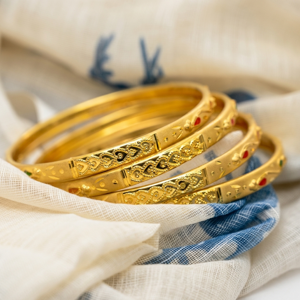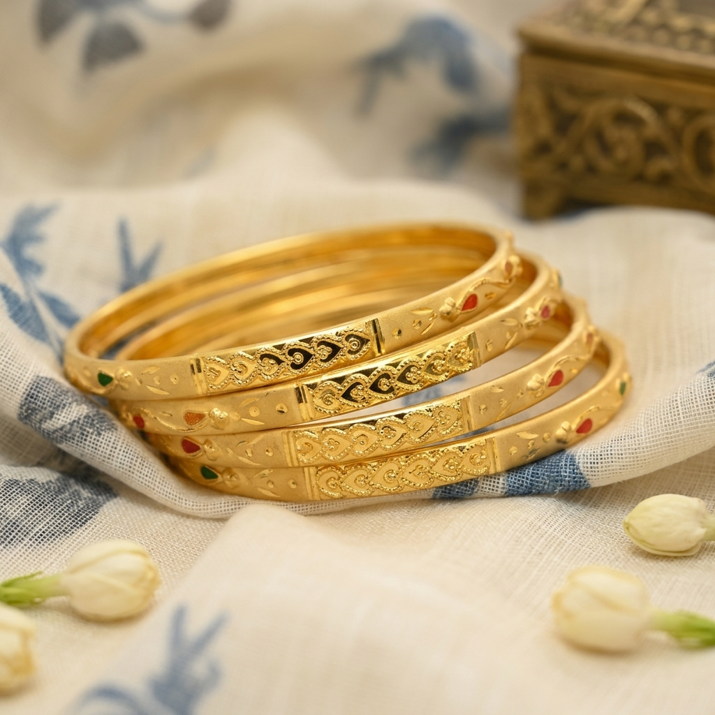 Our bangles offer a rich gold-like finish that enhances your beauty without compromising on comfort or affordability. Made with high-quality materials, they are lightweight, durable, and skin-friendly, ensuring long-lasting shine and charm. Whether you prefer simple, classy designs or heavy bridal styles, our collection has something for every taste.