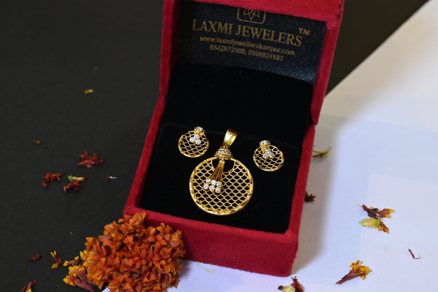 “Chic design meets elegant detail in this gold plated pendent set for the stylish ladies. Features include a traditional texture, royal style, and latest trend design. Shining gold plating and brass construction ensure the pendent set  will make a lasting impression. Perfect for any occasion!”