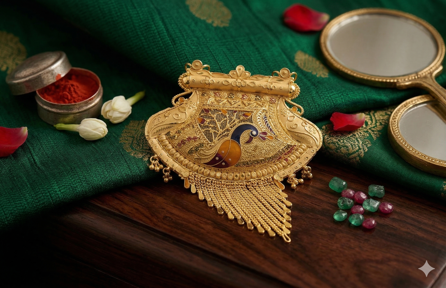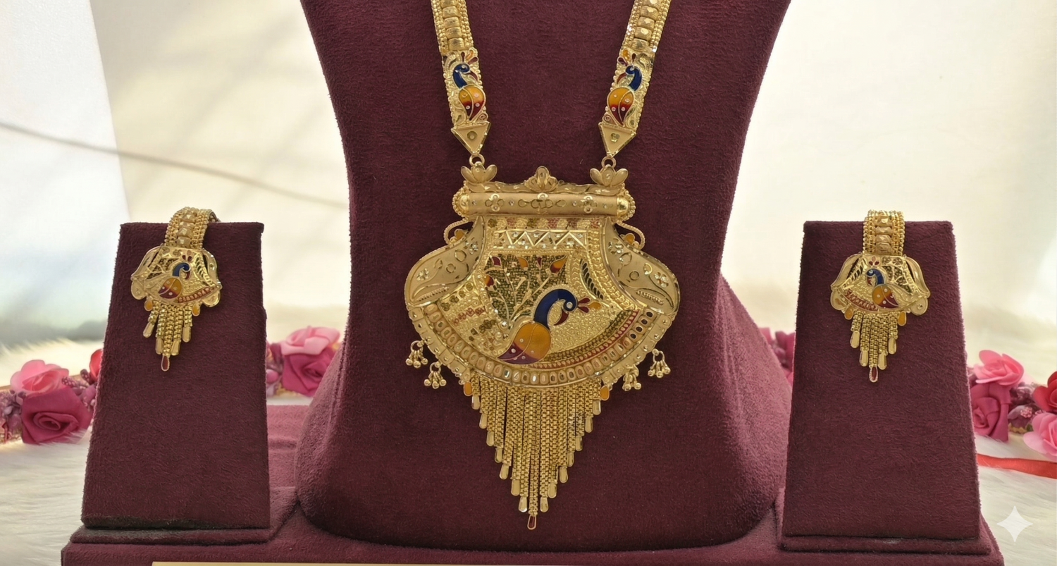 Design: Traditional Indian long necklace (Rani Haar) with multi-color enameled peacock detailing.