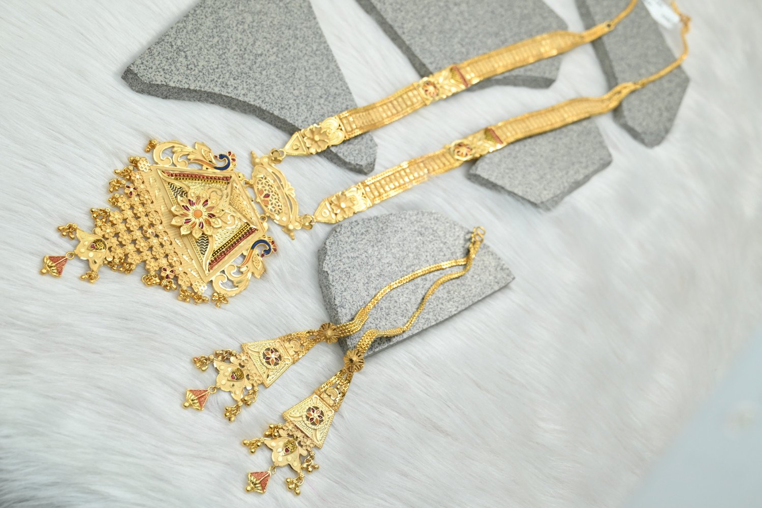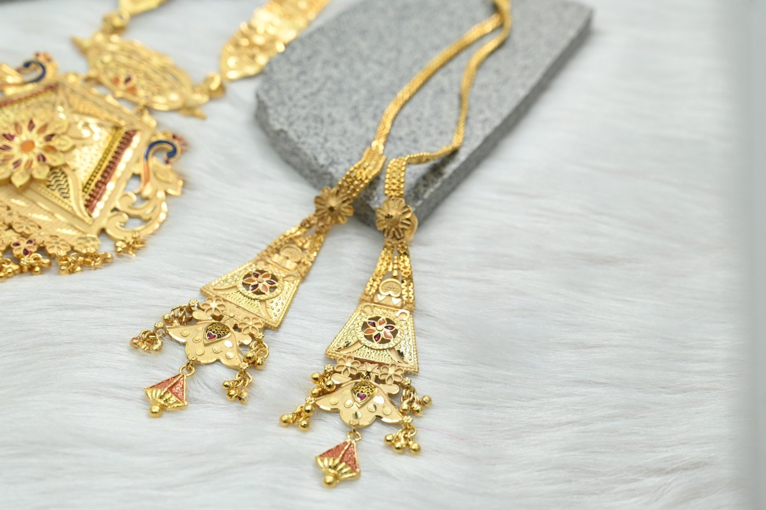 Command the room with the majestic splendor of our 1.5mg Gold Polish Rani Haar. This "Queen’s Necklace" is a masterpiece of traditional craftsmanship, featuring multi-layered strings and a grand centerpiece pendant. The premium 1.5mg gold plating offers a deep, regal luster that perfectly replicates the look of heritage gold, making it the ultimate statement piece for brides and wedding guests who desire a royal silhouette.
