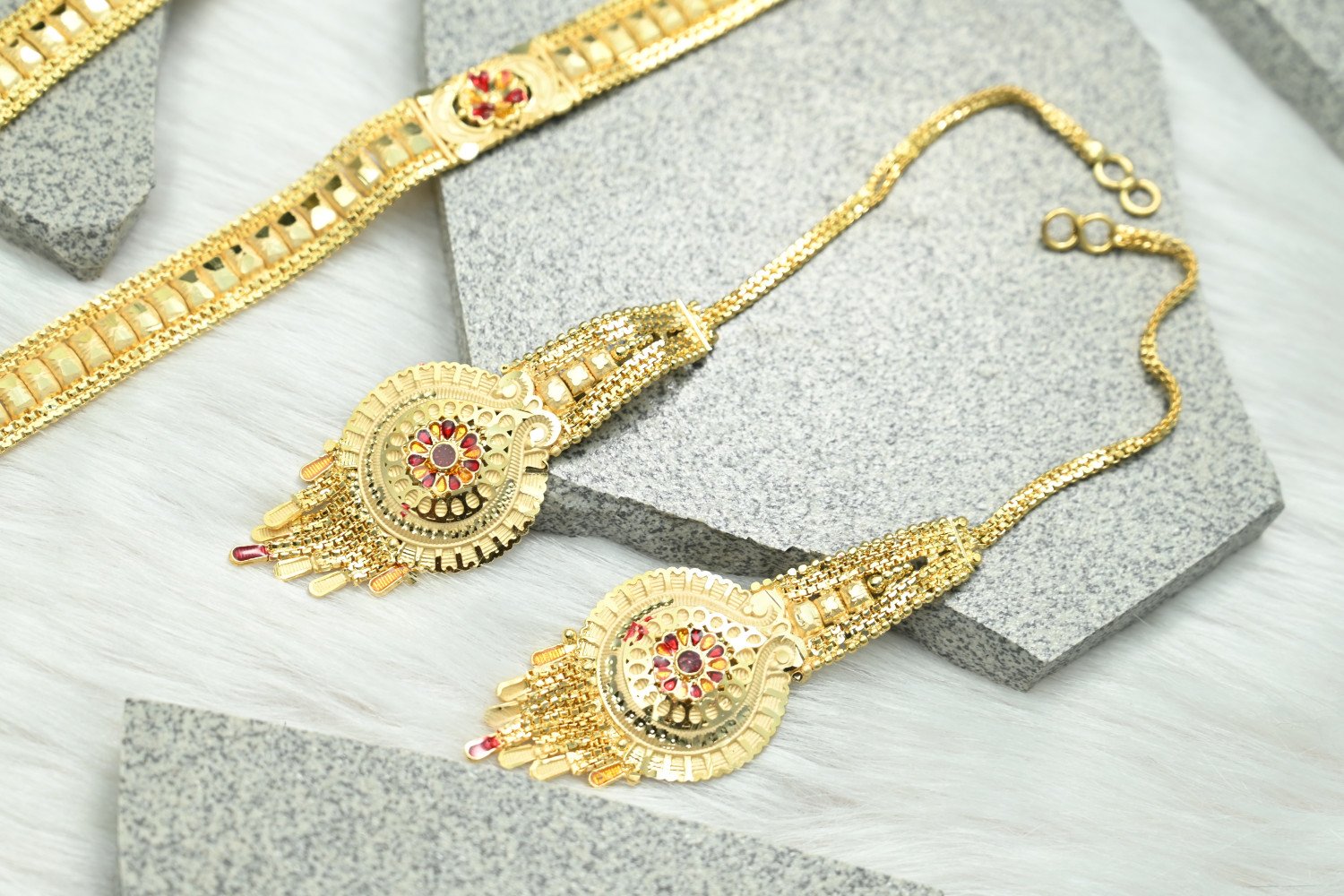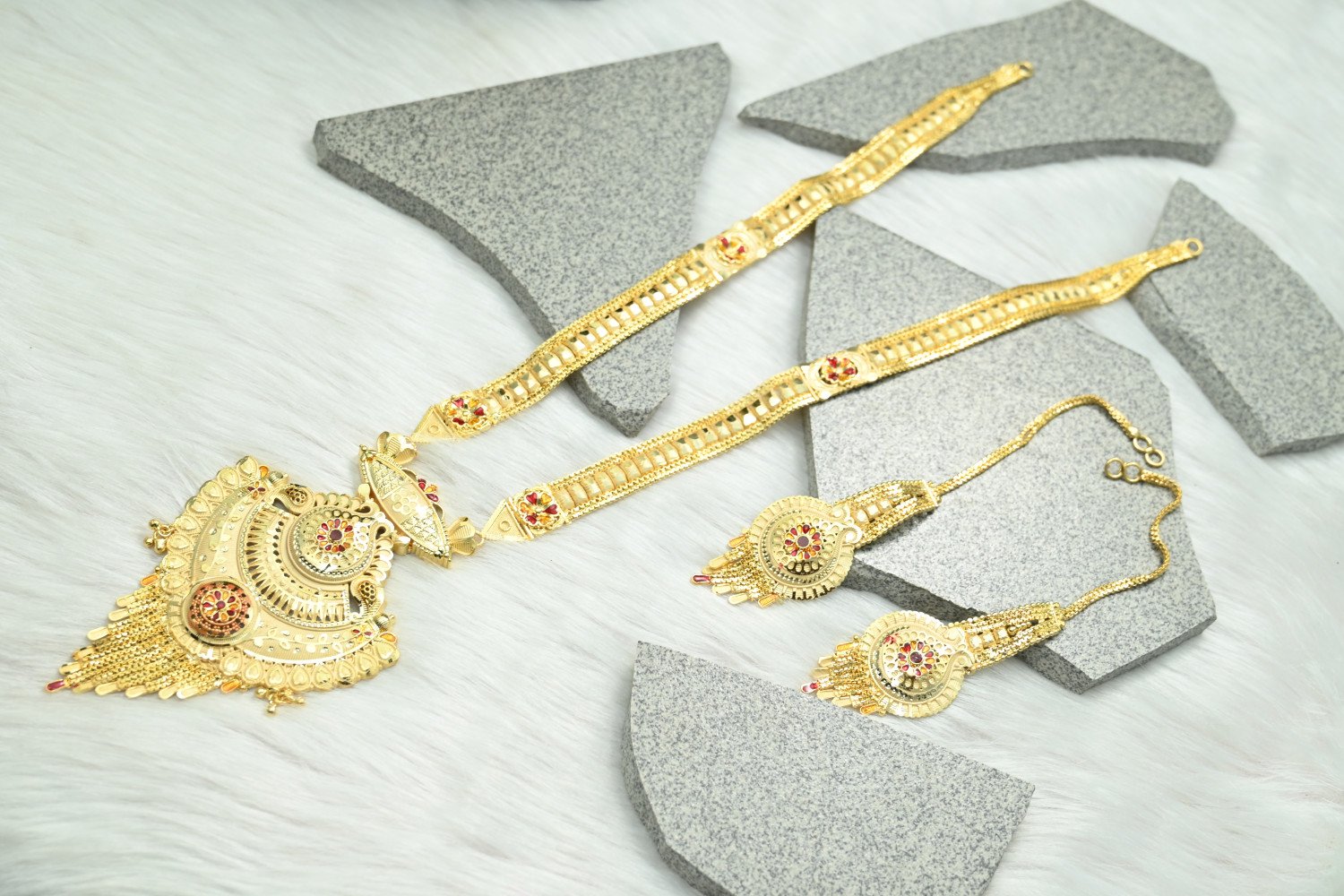 Command the room with the majestic splendor of our 1.5mg Gold Polish Rani Haar. This "Queen’s Necklace" is a masterpiece of traditional craftsmanship, featuring multi-layered strings and a grand centerpiece pendant. The premium 1.5mg gold plating offers a deep, regal luster that perfectly replicates the look of heritage gold, making it the ultimate statement piece for brides and wedding guests who desire a royal silhouette.