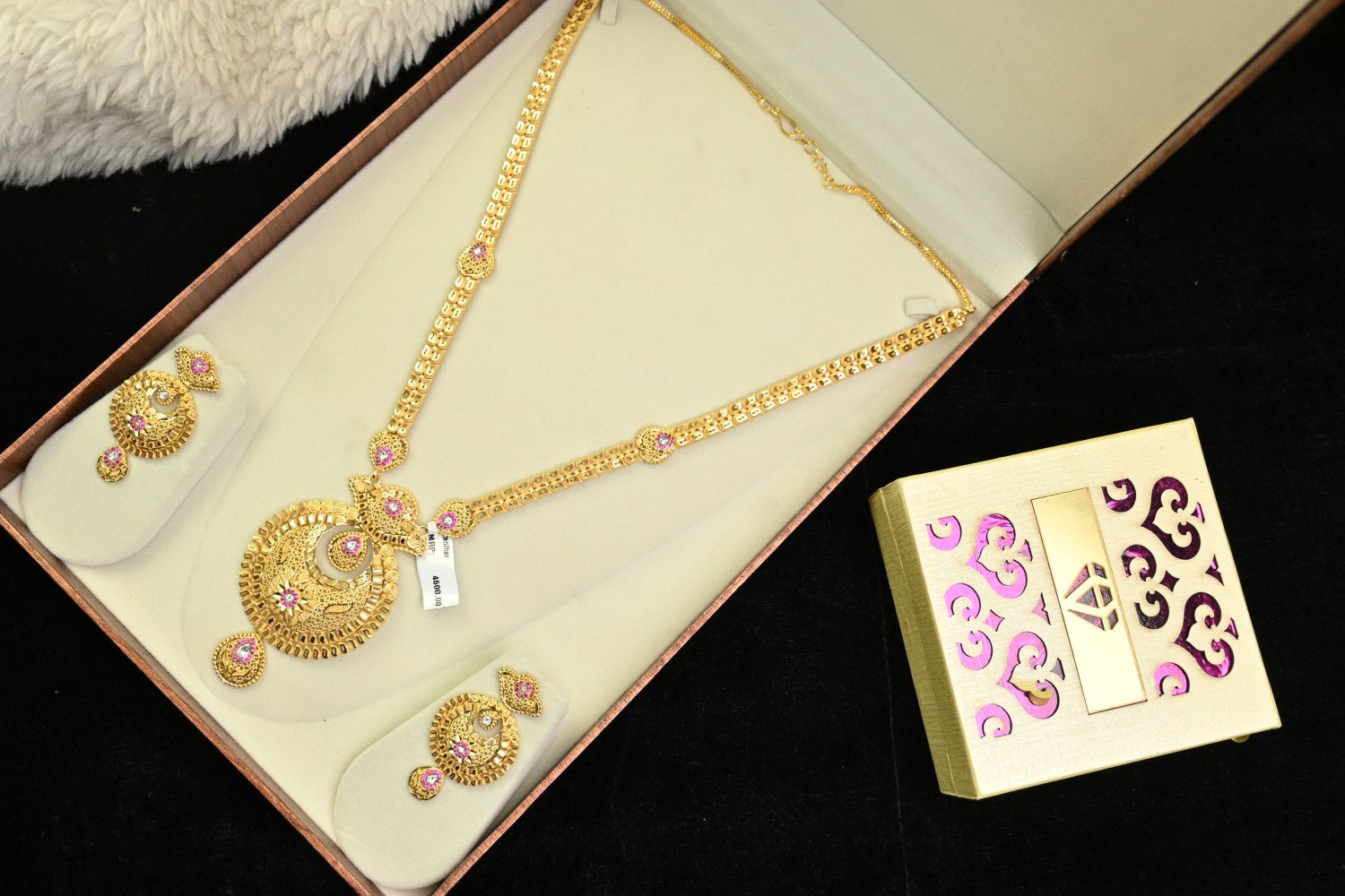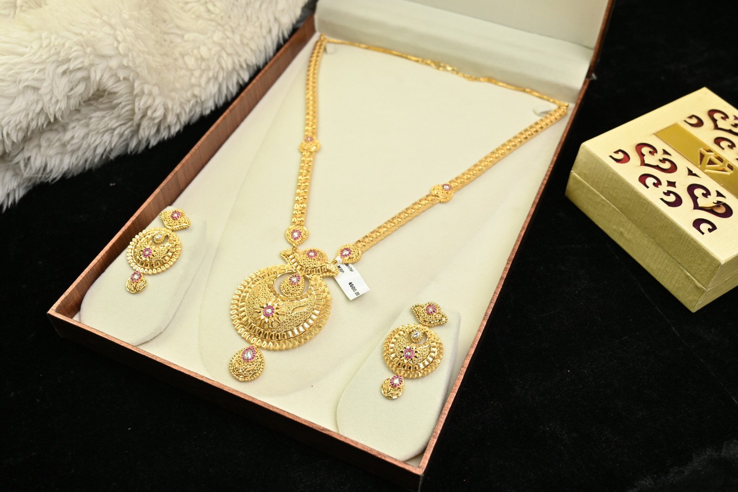 “Chic design meets elegant detail in this gold plated rani harr set for the stylish lady. Features include a traditional texture, royal style, and latest trend design. Shining gold plating and brass construction ensure the rani harr will make a lasting impression. Perfect for any occasion!”