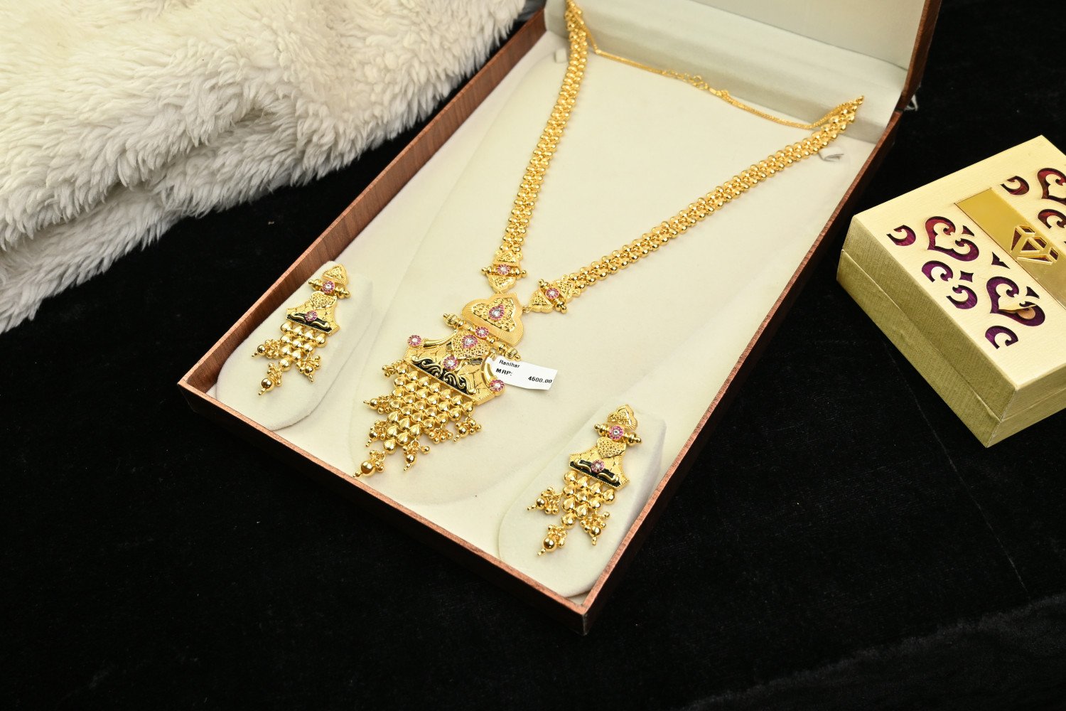 “Chic design meets elegant detail in this gold plated rani harr set for the stylish lady. Features include a traditional texture, royal style, and latest trend design. Shining gold plating and brass construction ensure the rani harr will make a lasting impression. Perfect for any occasion!”