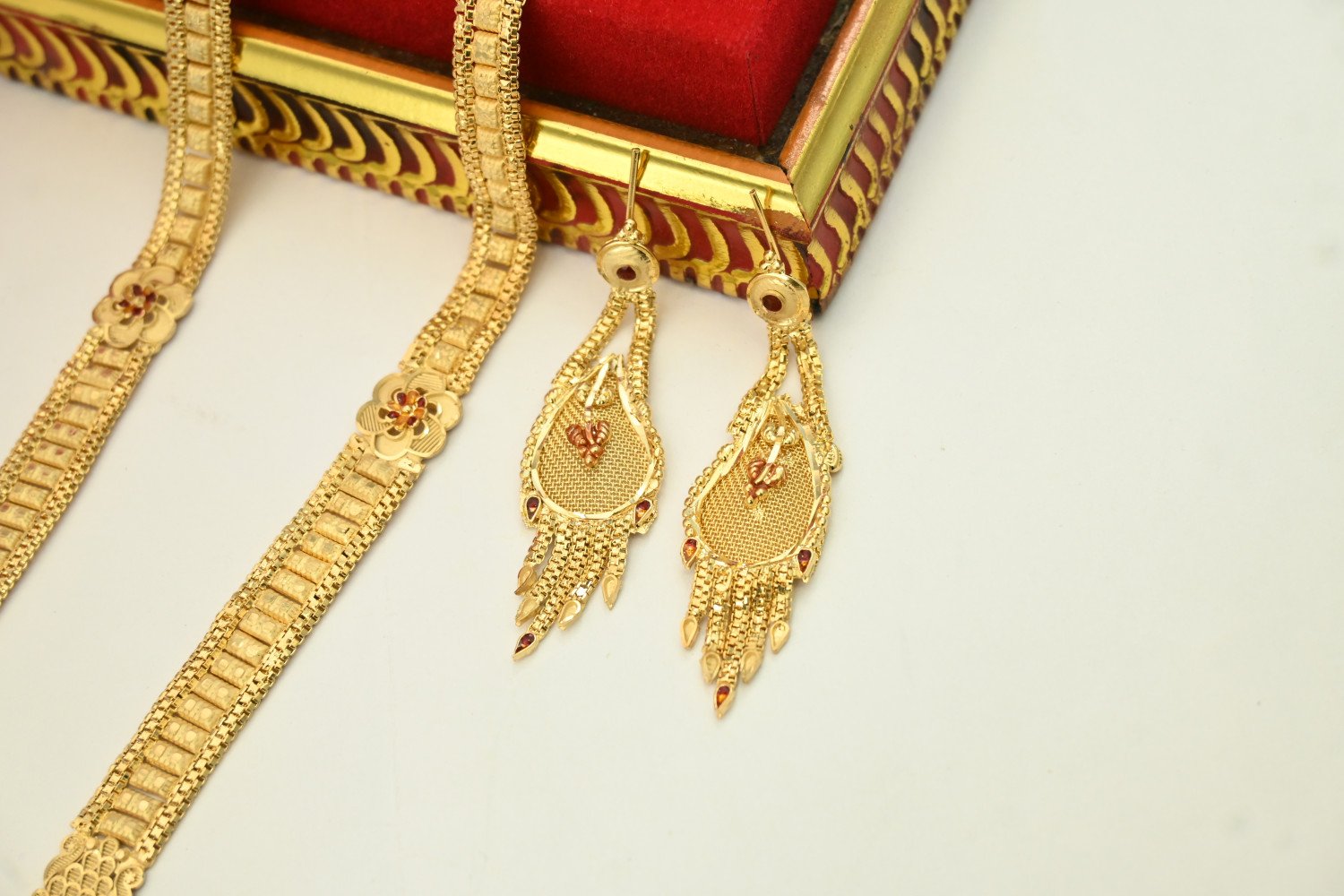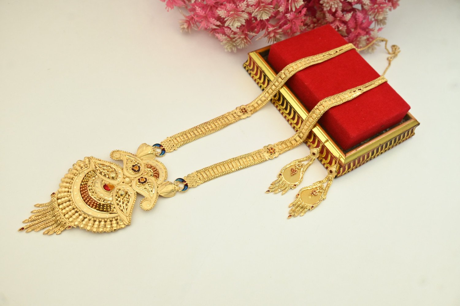 1. This is a 1.5 MG gold polish Rani Haar set, a statement piece rooted in traditional Indian royal jewelry. Below is a detailed description of this stunning article: