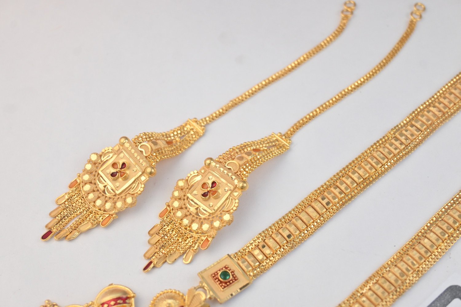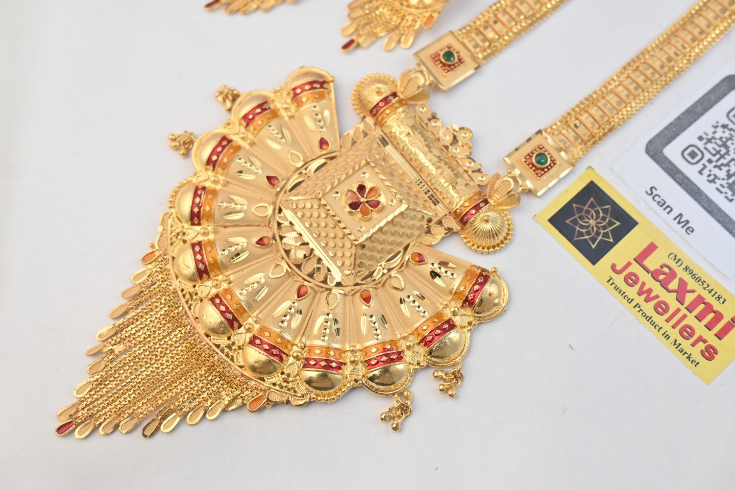 “Chic design meets elegant detail in this gold plate rani harr for the stylish lady. Features include a traditional texture, royal style, and latest trend design. Shining gold plating and brass construction ensure the  rani harr  will make a lasting impression. Perfect for any occasion!”