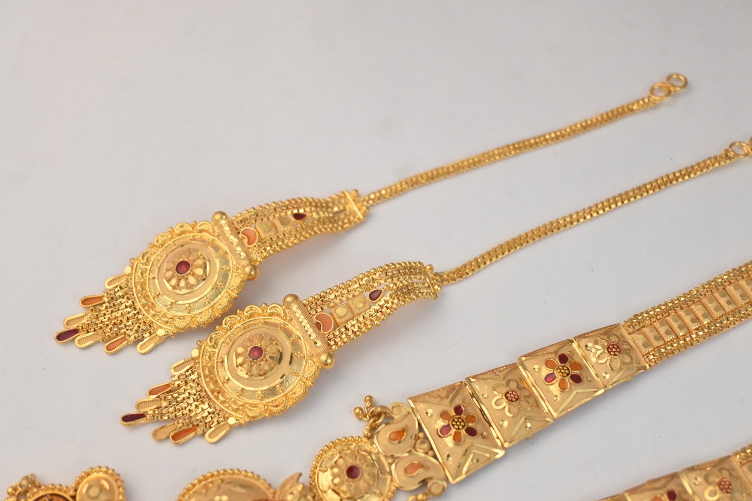 “Chic design meets elegant detail in this gold plate rani harr for the stylish lady. Features include a traditional texture, royal style, and latest trend design. Shining gold plating and brass construction ensure the  rani harr  will make a lasting impression. Perfect for any occasion!”