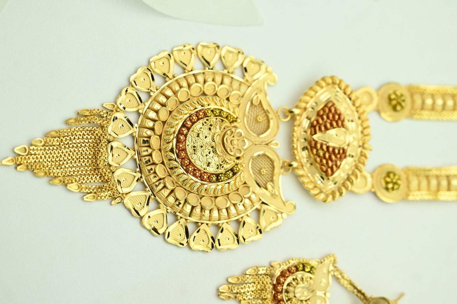 1. This is a 1.5 MG gold polish Rani Haar set, a statement piece rooted in traditional Indian royal jewelry. Below is a detailed description of this stunning article: