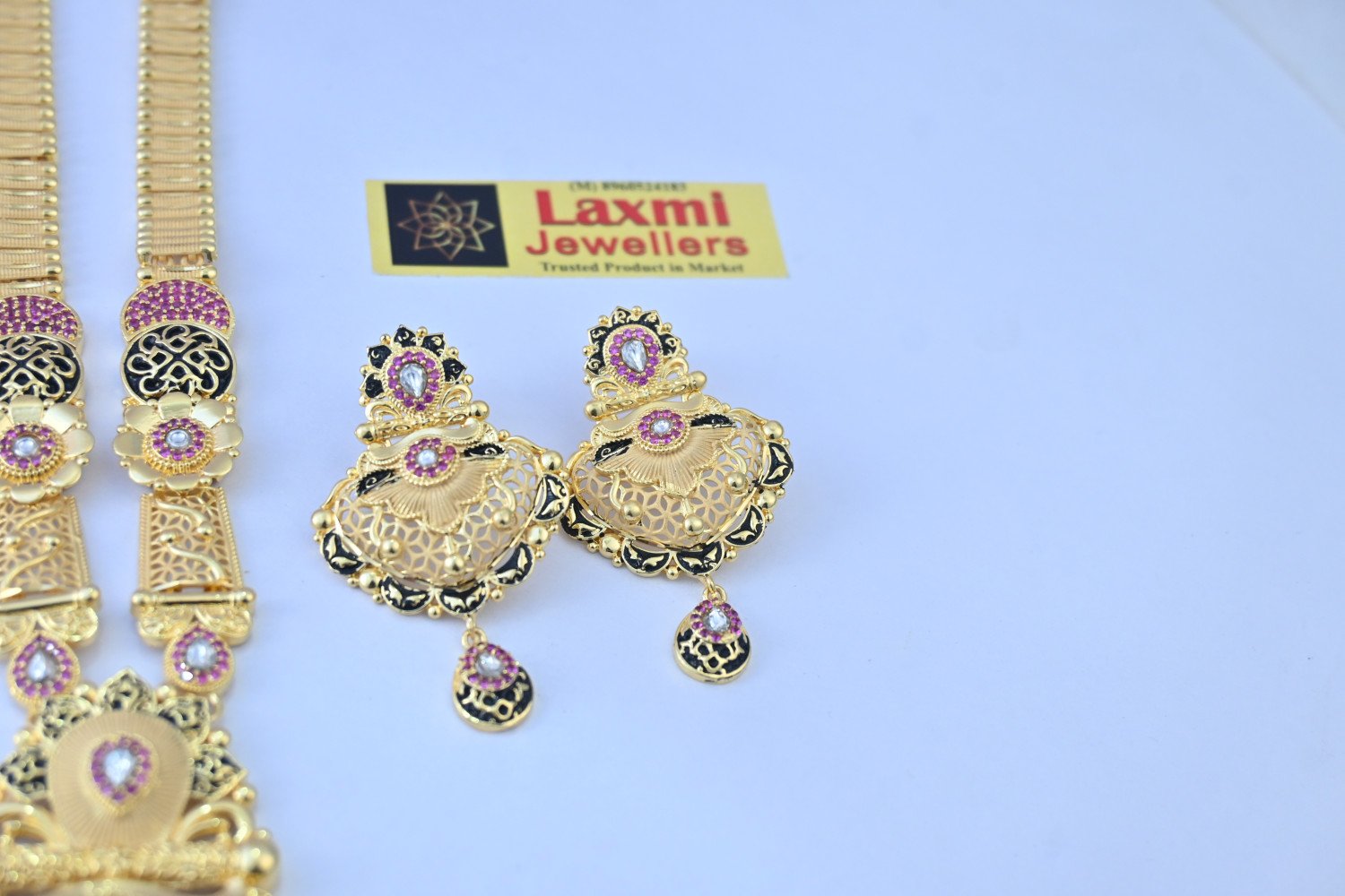 “Chic design meets elegant detail in this gold plate  rani harr set for the stylish lady. Features include a traditional texture, royal style, and latest trend design. Shining gold plating and brass construction ensure the   rani harr will make a lasting impression. Perfect for any occasion!” Laxmi Jewelers – our products are made from high quality material with best in comfort and look across the Globe. Our Brand is well known in jewelry sector and preferred by many Designers, Stars and Celebrities for the finest design. Perfect Gift our products are best as gift option for your Friends, Relative, Husband / Boyfriend during Anniversary, Birthday Valentines or any Festival. Care Instructions: Wipe your jewellery with a soft cloth after every use हर इस्तेमाल के बाद अपने आभूषण को एक मुलायम कपड़े से पोंछ लें Do not soak your jewellery in water आभूषण को पानी में न डुबाये Do not clean your jewellery in with soap or any other chemicals अपने आभूषणों को साबुन या किसी अन्य रसायन से साफ न करें Clean your jewellery using a soft brush, dipped in jewellery cleaning solution only केवल आभूषण की सफाई के रसायन के साथ एक नरम ब्रश का उपयोग करके अपने आभूषण को साफ करें  Repolish : This item gets re-polished here. हमारे यहाँ इस सामान की वापस से पोलिश हो जाती है NOTE – While booking, please inquire about the length and width of the luggage and information number- 8090965577 बुकिंग करते टाइम सामान की लम्बाई चौड़ाई जरुर से पूछ लीजिये इनफार्मेशन नंबर- 8090965577