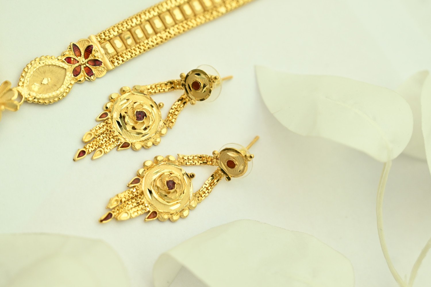11. The top part of the earrings has floral work and a similar textured finish, making them perfect companions to the necklace.