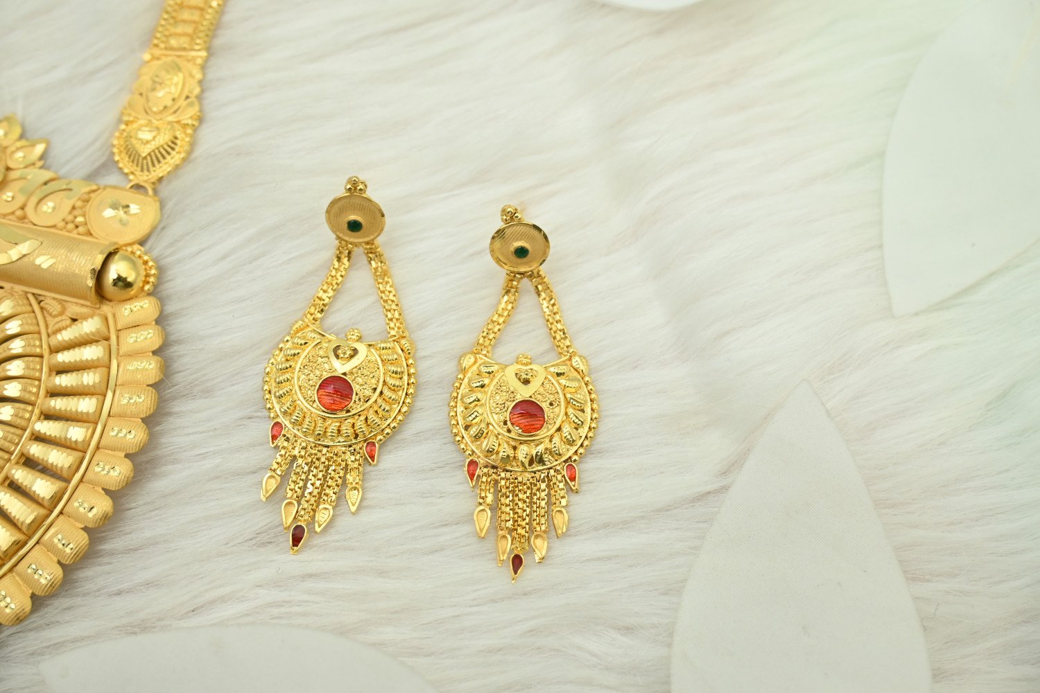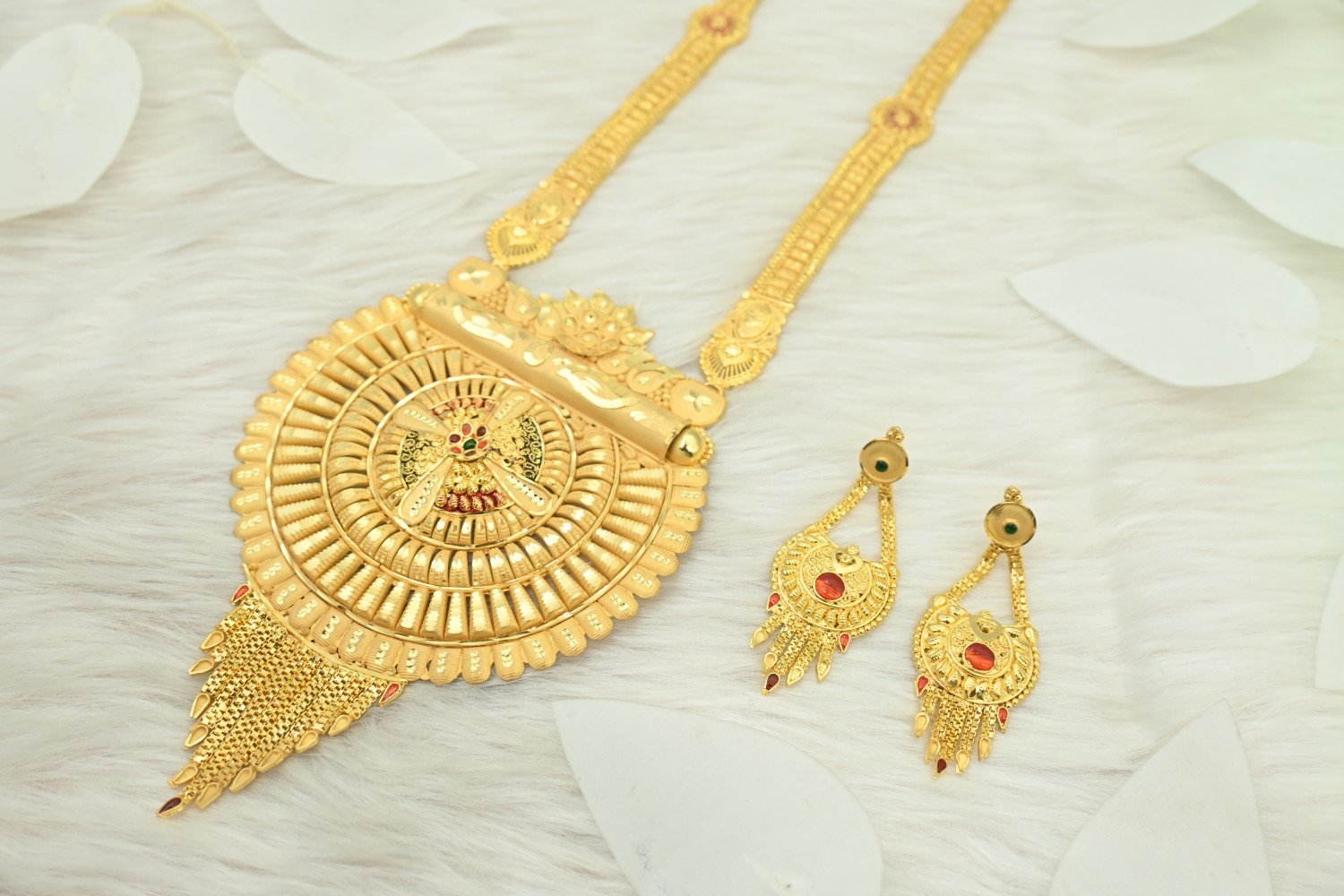 Embody royalty with our exquisitely crafted Gold Plated Rani Haar. Designed for the woman who loves elegance, this masterpiece features intricate traditional textures combined with a majestic royal silhouette. The high-sheen gold plating over premium brass construction ensures you command attention at every wedding, gala, or special occasion.