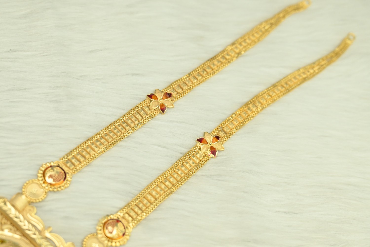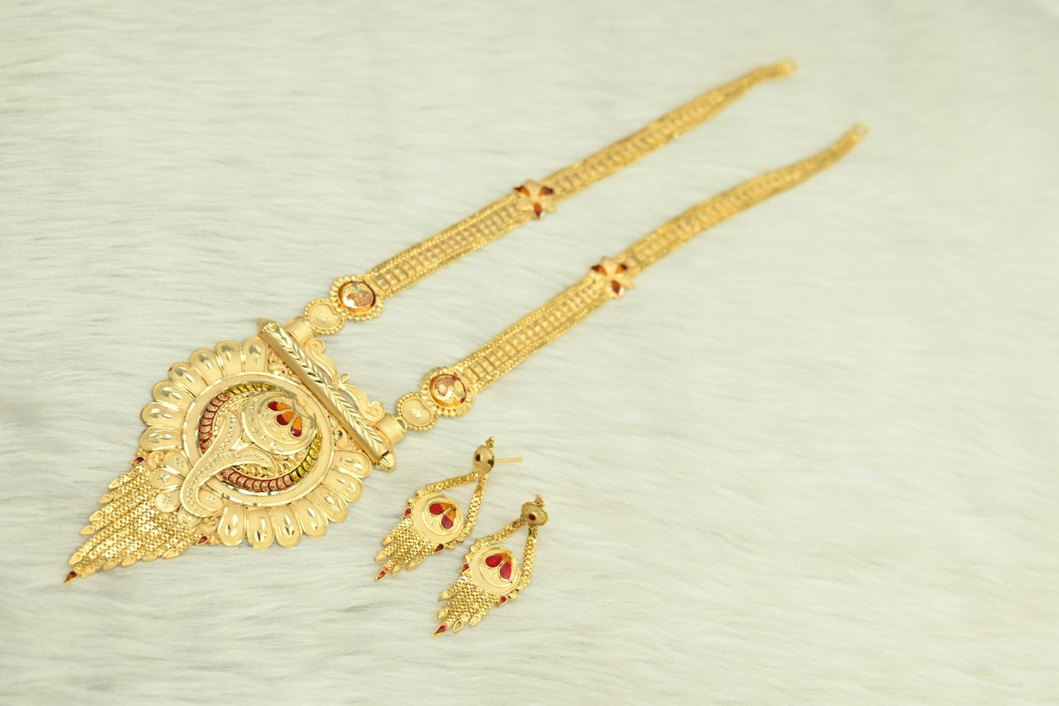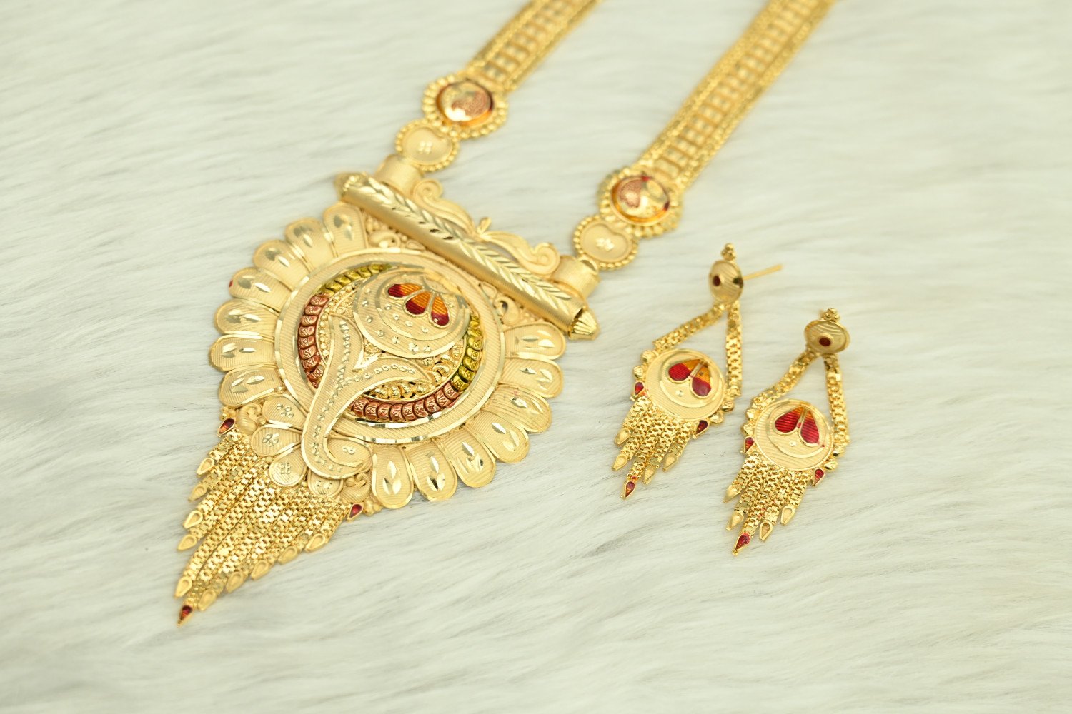 Command the room with the majestic splendor of our 1.5mg Gold Polish Rani Haar. This "Queen’s Necklace" is a masterpiece of traditional craftsmanship, featuring multi-layered strings and a grand centerpiece pendant. The premium 1.5mg gold plating offers a deep, regal luster that perfectly replicates the look of heritage gold, making it the ultimate statement piece for brides and wedding guests who desire a royal silhouette.