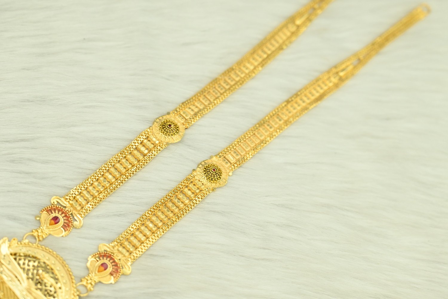 Command the room with the majestic splendor of our 1.5mg Gold Polish Rani Haar. This "Queen’s Necklace" is a masterpiece of traditional craftsmanship, featuring multi-layered strings and a grand centerpiece pendant. The premium 1.5mg gold plating offers a deep, regal luster that perfectly replicates the look of heritage gold, making it the ultimate statement piece for brides and wedding guests who desire a royal silhouette.