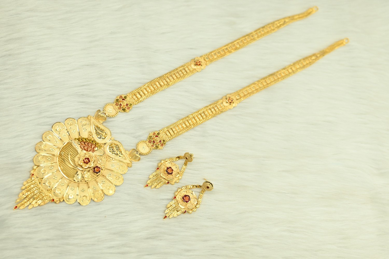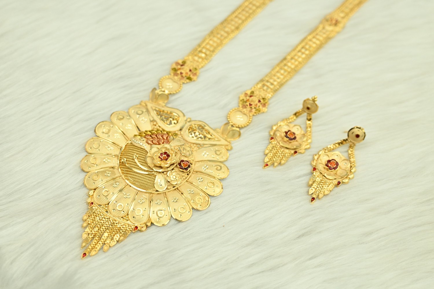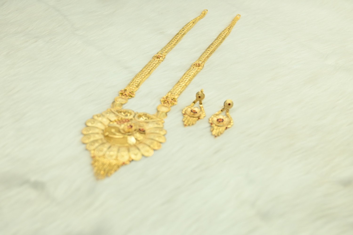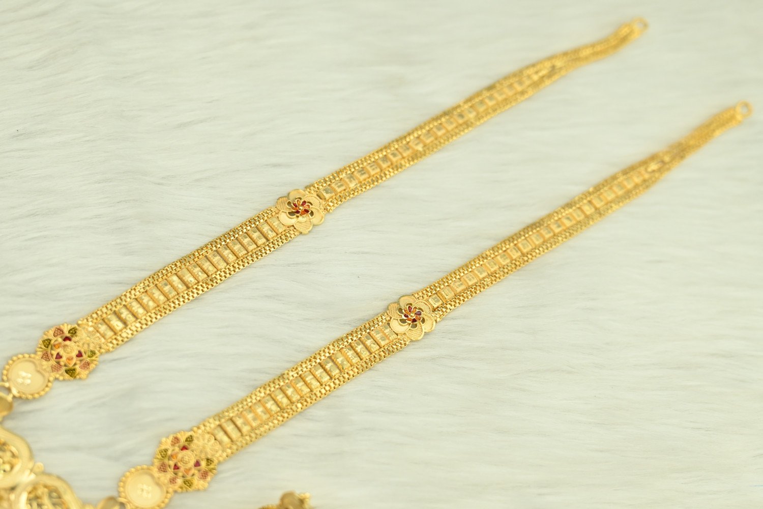 Command the room with the majestic splendor of our 1.5mg Gold Polish Rani Haar. This "Queen’s Necklace" is a masterpiece of traditional craftsmanship, featuring multi-layered strings and a grand centerpiece pendant. The premium 1.5mg gold plating offers a deep, regal luster that perfectly replicates the look of heritage gold, making it the ultimate statement piece for brides and wedding guests who desire a royal silhouette.