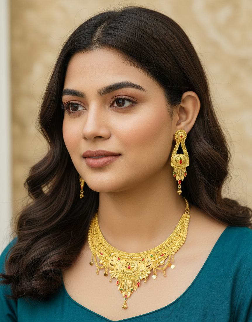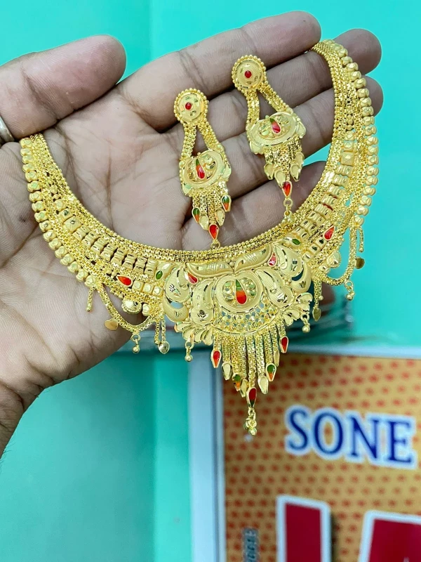 Discover the pinnacle of luster with our 2mg Gold Polish Necklace Set. Crafted to mirror the brilliance of solid gold, this collection features a specialized 2mg plating process that provides a deeper, longer-lasting glow. Whether it's a grand wedding or a festive celebration, the intricate detailing and radiant finish ensure you carry a look of pure opulence and unmatched sophistication.