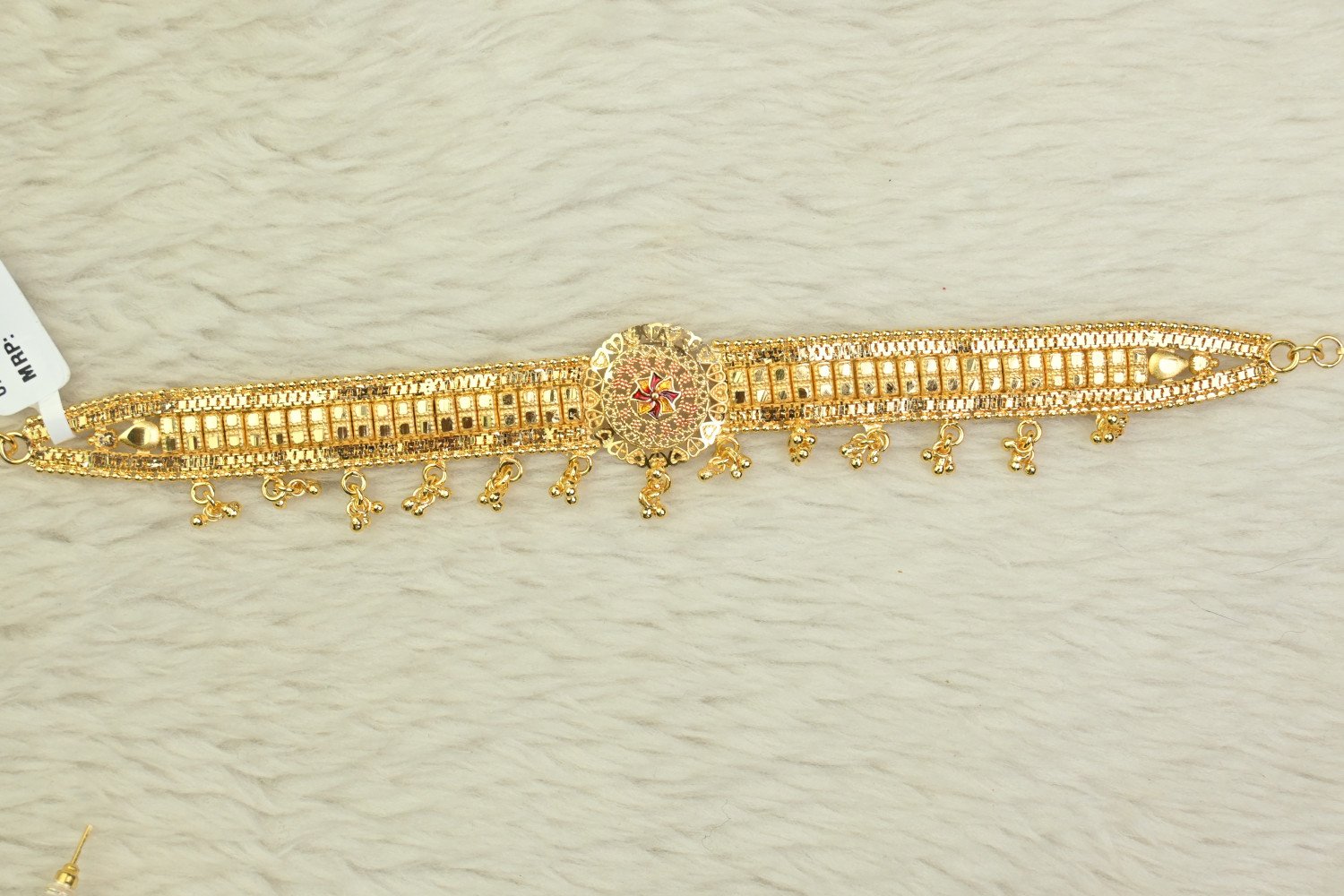 “Chic design meets elegant detail in this gold plated chikpatti for the stylish ladies. Features include a traditional texture, royal style, and latest trend design. Shining gold plating and brass construction ensure the chikpatti will make a lasting impression. Perfect for any occasion!”