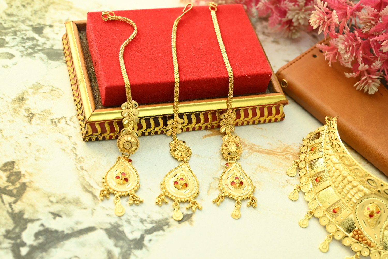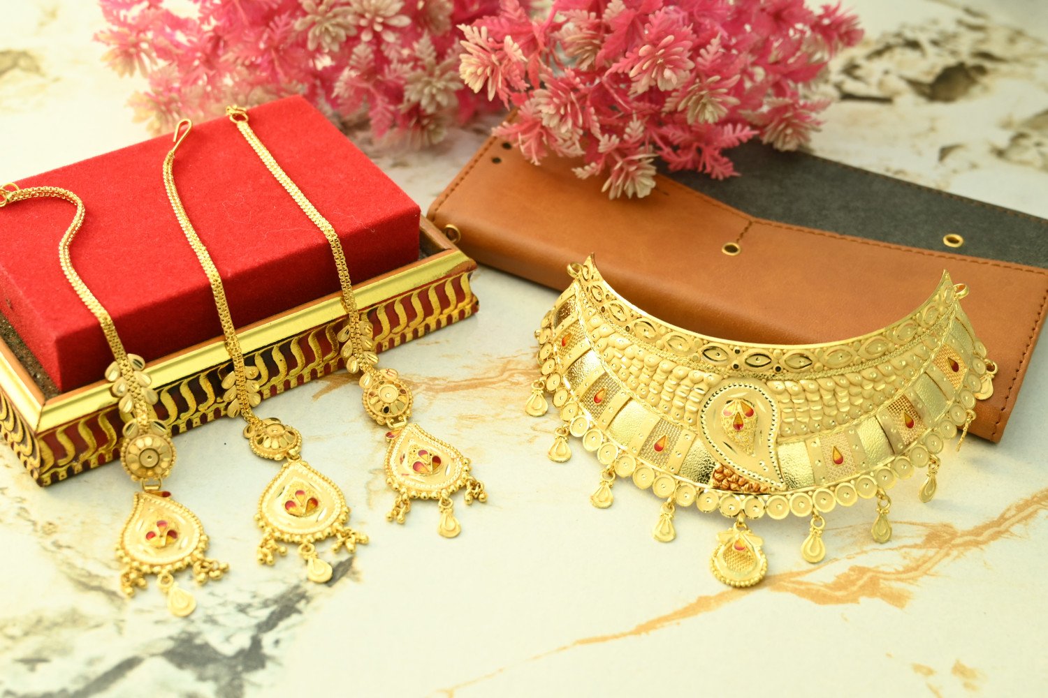 Enhance your elegance with our 1.5 mile gram gold-plated choker, crafted with high-quality materials for a rich and lasting shine. Designed to give you the look of real gold jewellery at an affordable price, this beautiful piece perfectly complements both traditional and modern outfits. Ideal for weddings, parties, and festive occasions. ?