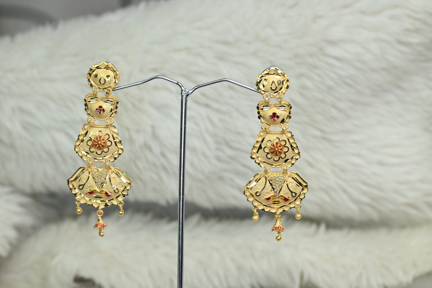 “Chic design meets elegant detail in this gold plated earring for the stylish ladies. Features include a traditional texture, royal style, and latest trend design. Shining gold plating and brass construction ensure the earring will make a lasting impression. Perfect for any occasion!”