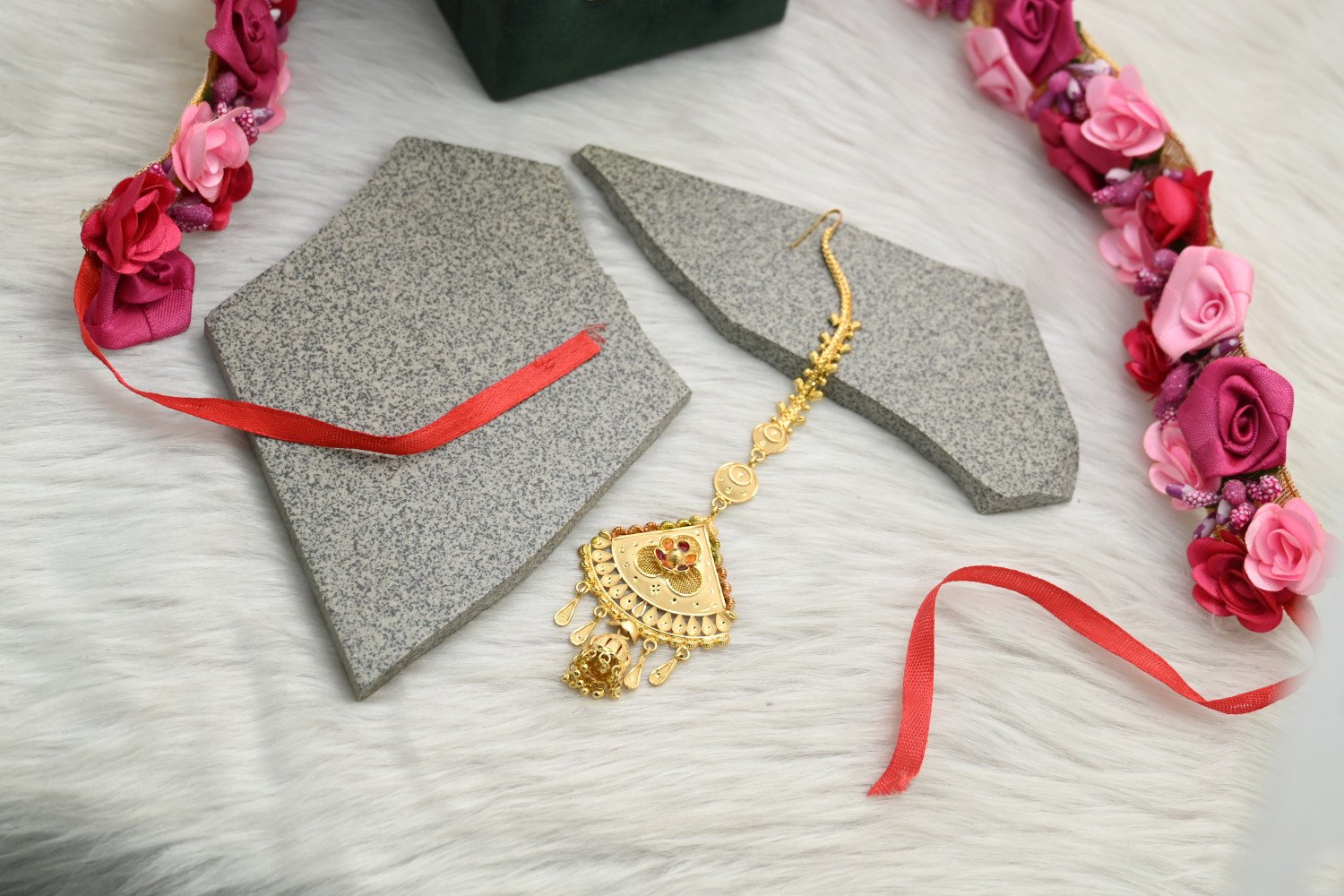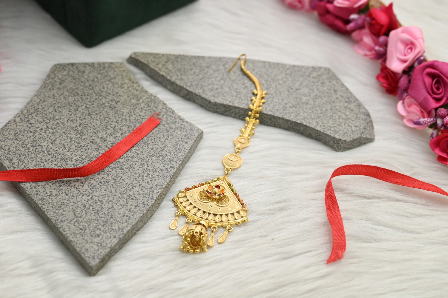 Crown your look with the divine elegance of our 1.5mg Gold Polish Maang Tikka. As the crowning jewel of a woman's shringar, this piece is a masterclass in intricate artistry. Featuring exquisite detailing and a flawless finish, our Maang Tikka is designed to sit gracefully on the forehead, framing the face with a glow that is nothing short of celestial. The premium 1.5mg gold plating ensures a rich, authentic brilliance that captures the soul of traditional Indian heritage.