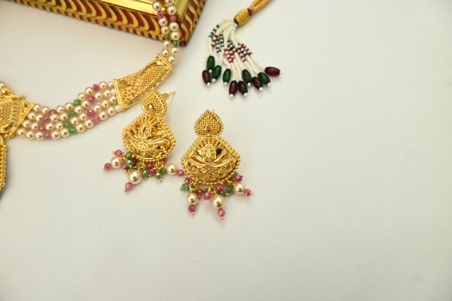 1. This is a 1.5 MG gold polish Rani Haar set, a statement piece rooted in traditional Indian royal jewelry. Below is a detailed description of this stunning article: