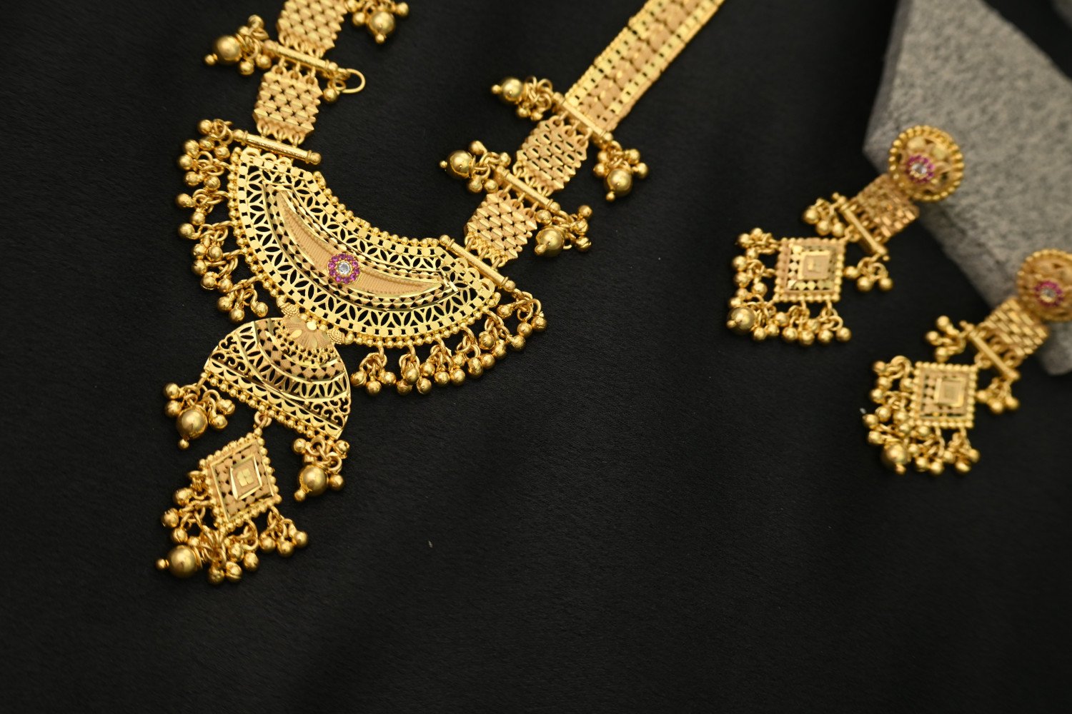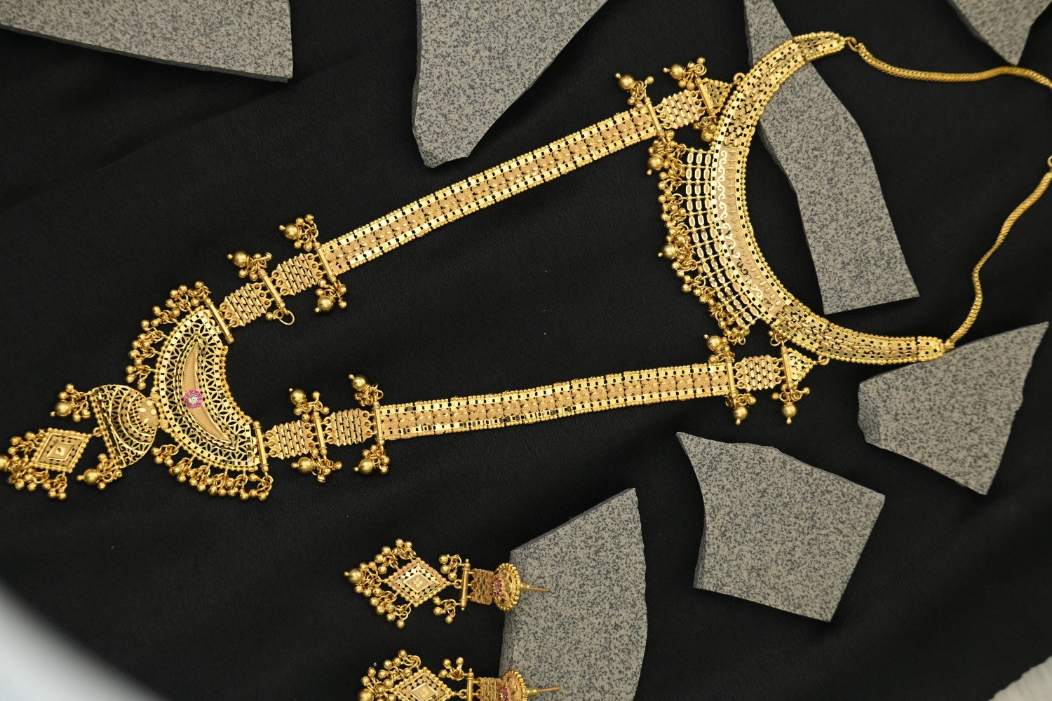 1. This is a 1.5 MG gold polish Rani Haar set, a statement piece rooted in traditional Indian royal jewelry. Below is a detailed description of this stunning article: