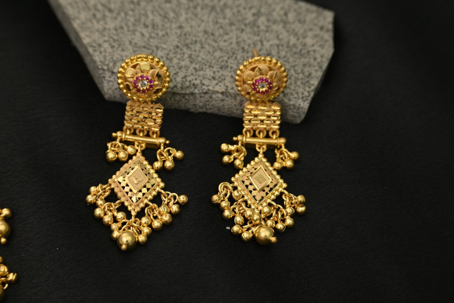 11. The top part of the earrings has floral work and a similar textured finish, making them perfect companions to the necklace.
