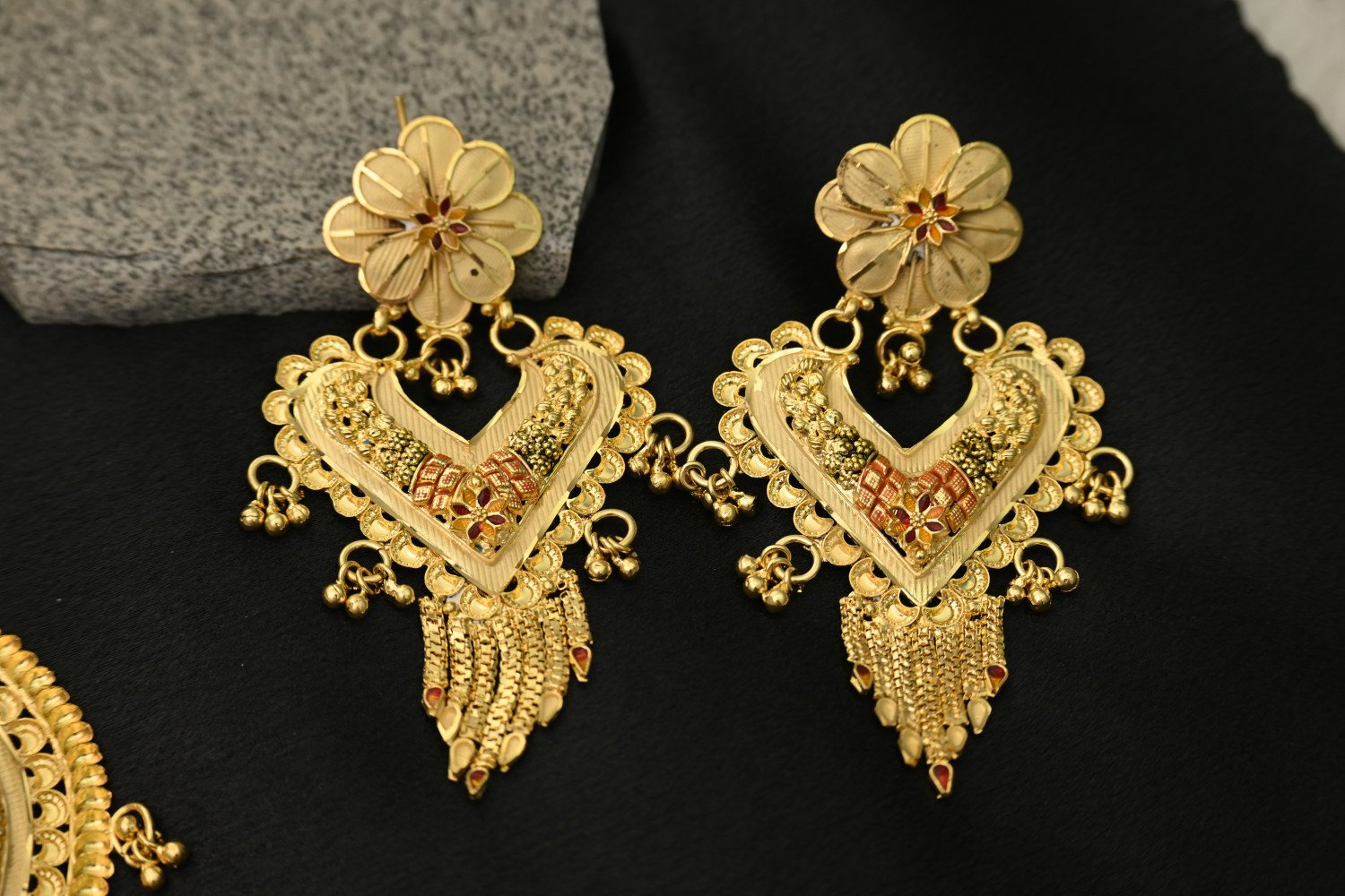 11. The top part of the earrings has floral work and a similar textured finish, making them perfect companions to the necklace.