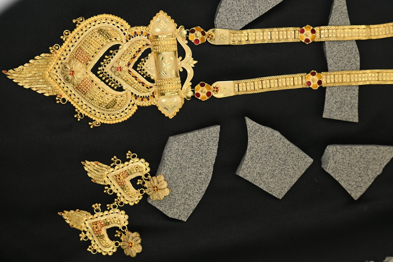 1. This is a 1.5 MG gold polish Rani Haar set, a statement piece rooted in traditional Indian royal jewelry. Below is a detailed description of this stunning article: