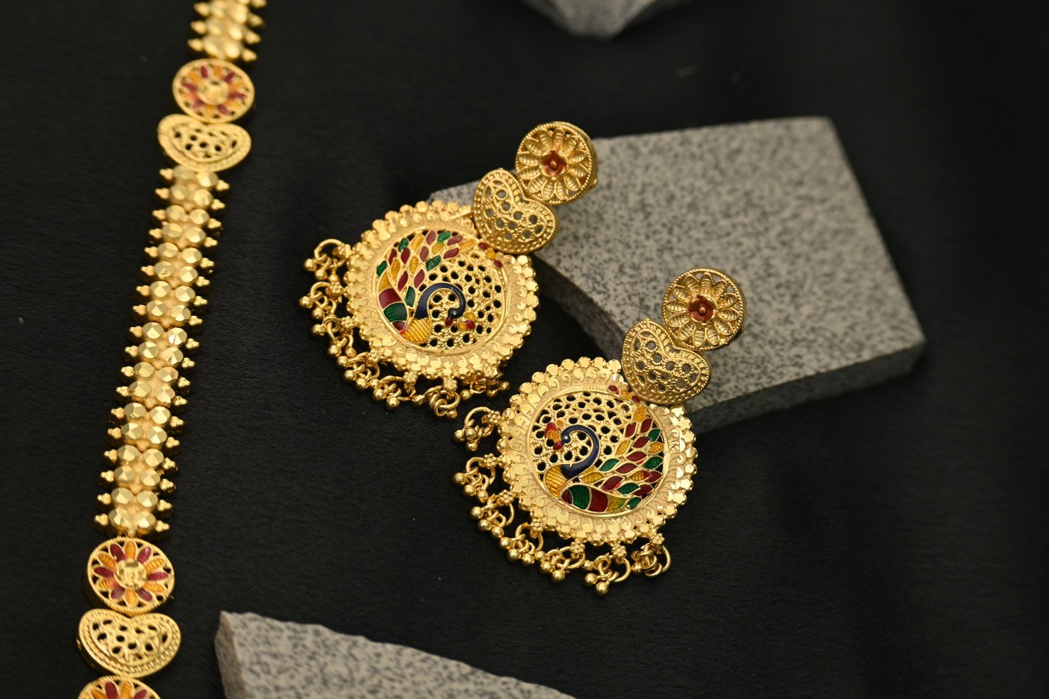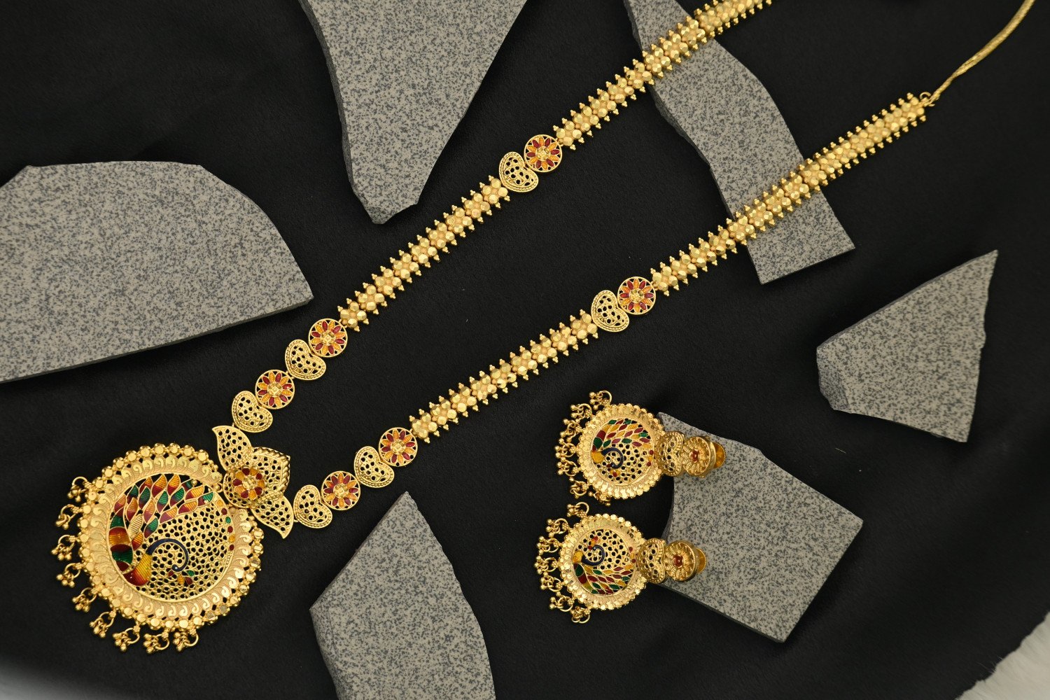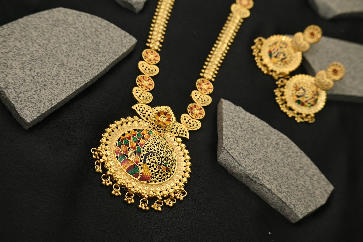7. Touches of multi-color enamel work (meena-style) in deep blue, red, and black tones highlight the traditional craftsmanship.