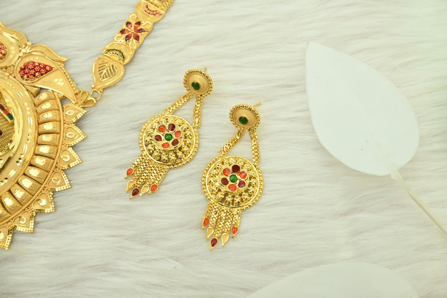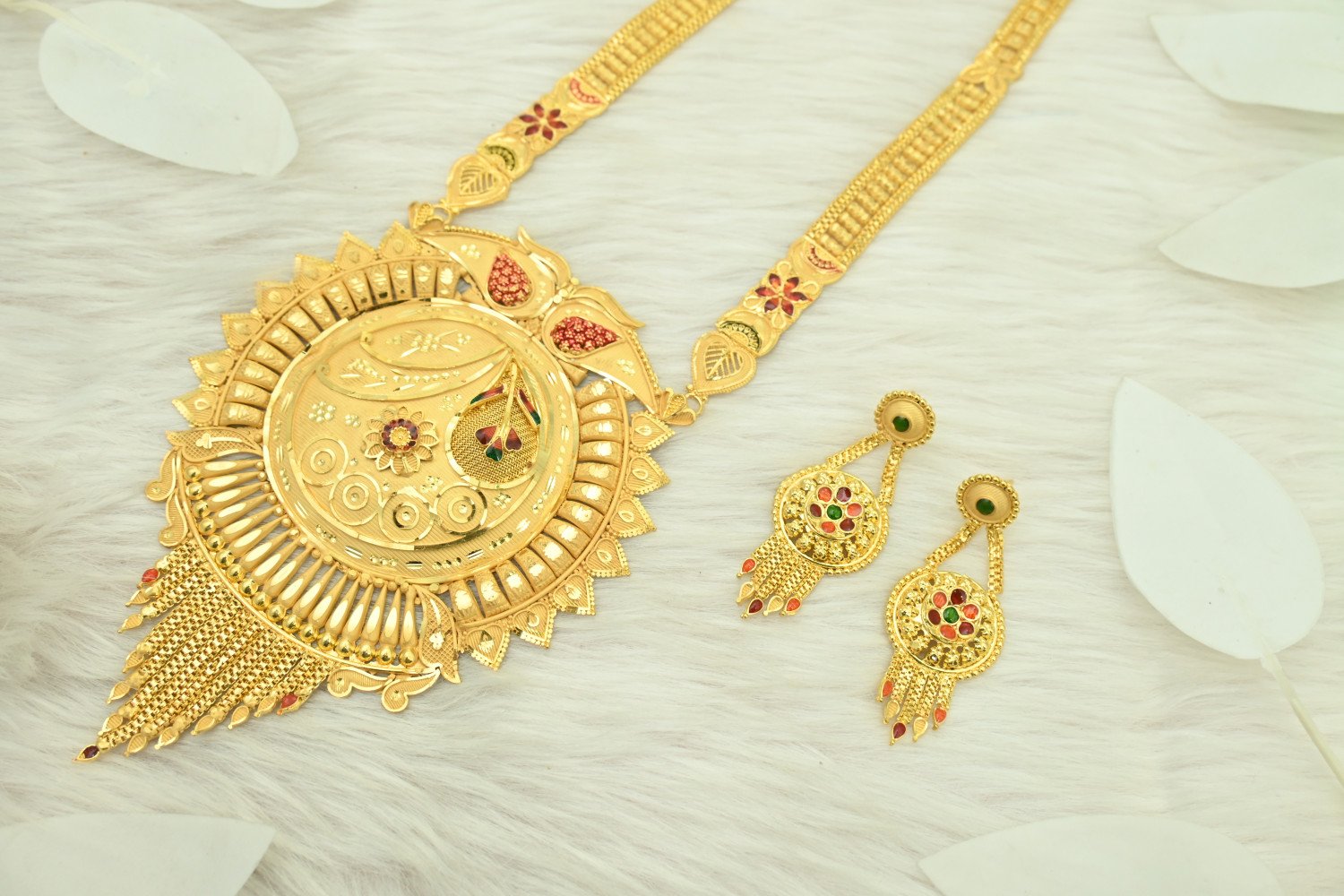 Embody royalty with our exquisitely crafted Gold Plated Rani Haar. Designed for the woman who loves elegance, this masterpiece features intricate traditional textures combined with a majestic royal silhouette. The high-sheen gold plating over premium brass construction ensures you command attention at every wedding, gala, or special occasion.