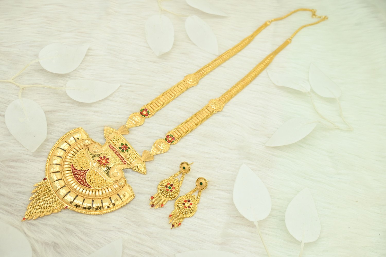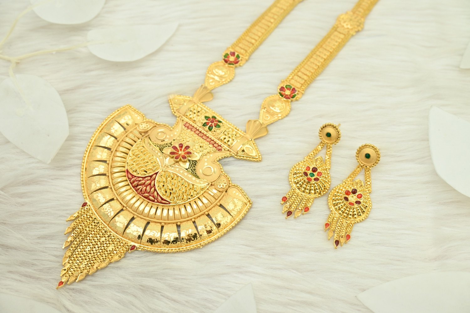 Embody royalty with our exquisitely crafted Gold Plated Rani Haar. Designed for the woman who loves elegance, this masterpiece features intricate traditional textures combined with a majestic royal silhouette. The high-sheen gold plating over premium brass construction ensures you command attention at every wedding, gala, or special occasion.